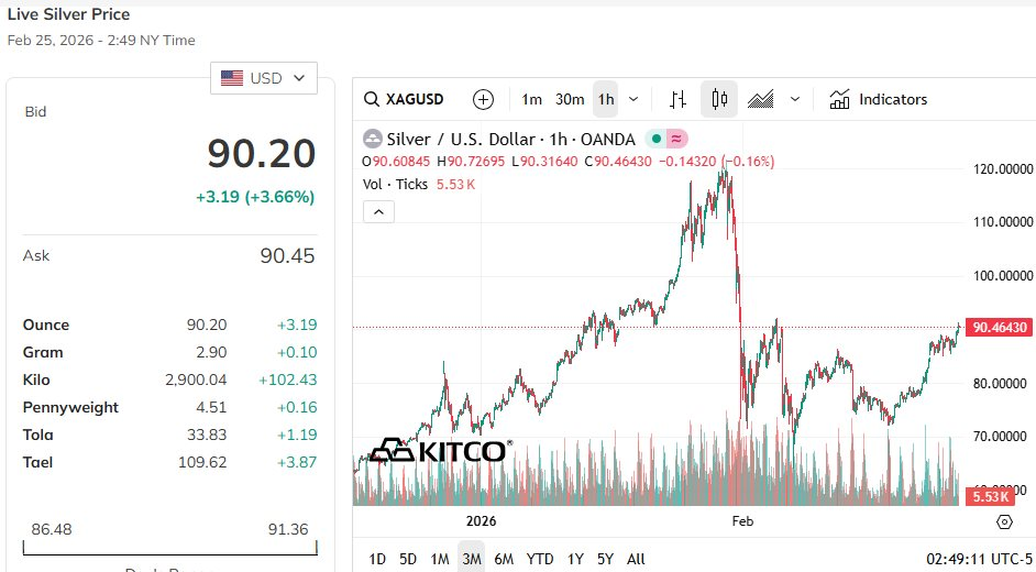 Trên sàn COMEX (Mỹ), giá bạc cũng ghi nhận mức tăng gần 4%, lên vùng 90 USD/ounce, thấp hơn khoảng 10 USD/ounce so với mặt bằng giá tại Thượng Hải.