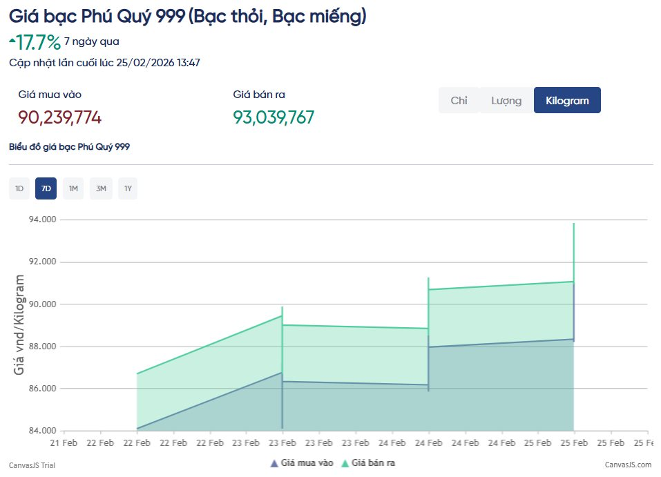 Tại thị trường trong nước, giá bạc cũng theo đà tăng mạnh. Theo dữ liệu từ Tập đoàn Vàng bạc Đá quý Phú Quý, bạc thỏi 999 1kg có giá là 90,2 triệu đồng/kg (mua vào) và 93 triệu đồng/kg (bán ra), tăng 17,7% trong vòng 7 ngày qua.