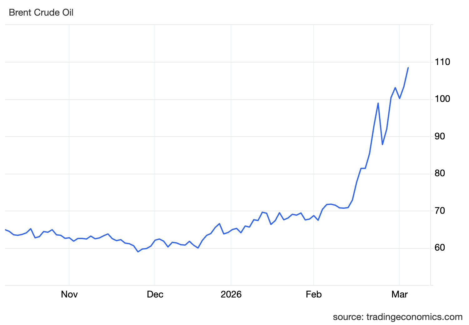 Giá dầu Brent kỳ hạn tăng 5,3 đô la, tương đương 5,08%, lên 108,5 USD một thùng vào tối ngày 18/3. Giá dầu thô West Texas Intermediate của Mỹ tăng 2,32 USD/thùng tương đương 2,41%, lên 98,4 đô la.