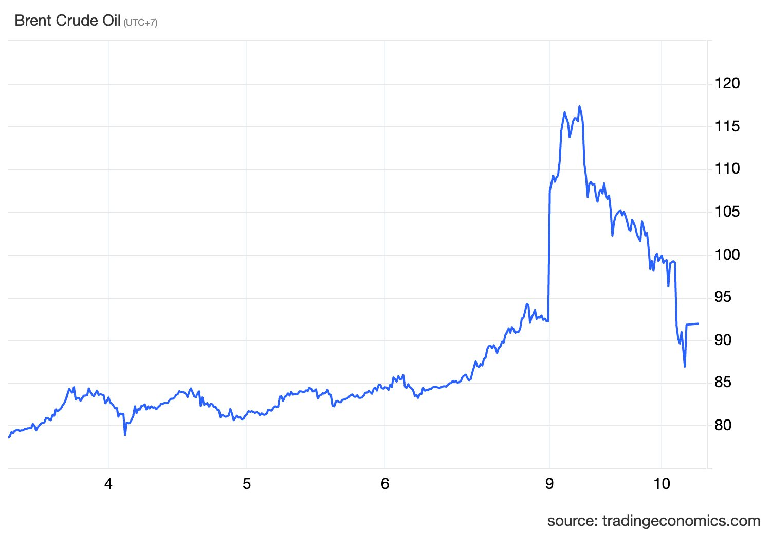 Giá dầu thô của Mỹ giảm còn 87,8 USD/thùng trong khi dầu Brent cũng bắt đầu giảm mạnh, ở mức 91,7 USD/thùng. Đây là mức giá dễ chịu hơn nhiều so với gần 120 USD/thùng vào đầu phiên ngày 9/3.