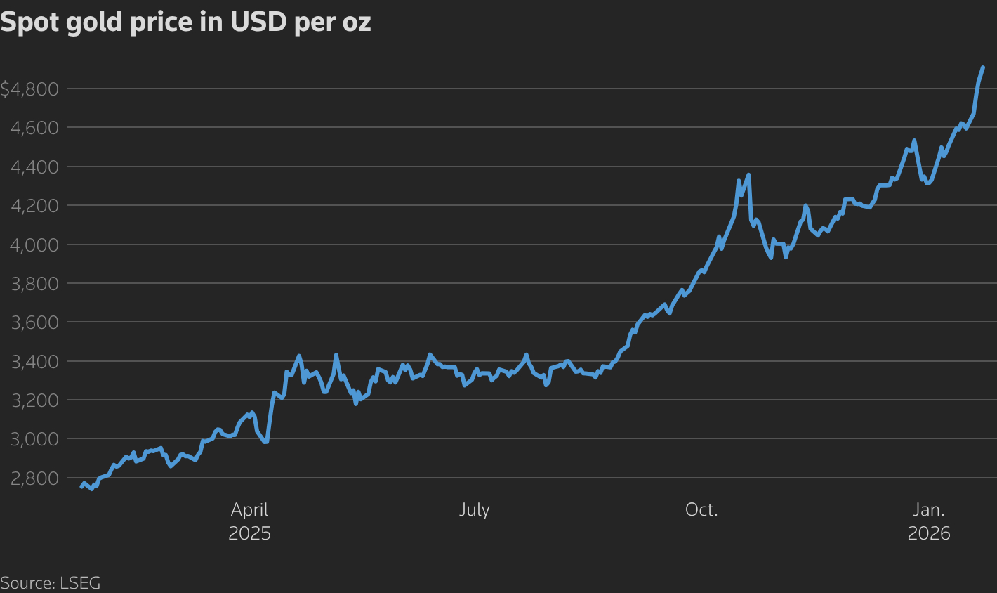 Cụ thể, giá vàng giao ngay đã tăng lên mức kỷ lục 4.917,65 USD/ounce. Giá vàng tương lai giao tháng 2 tăng 1,6% lên 4.913,4 USD/ounce.
