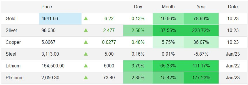 Ngày 22/1, giá vàng thế giới lần đầu tiên trong lịch sử vượt mốc 4.900 USD/ounce. Song song với đó, giá bạc và bạch kim cũng lập kỷ lục mới.