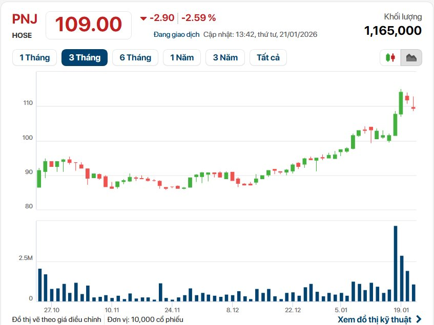 Kết thúc năm 2025, PNJ ghi nhận mức lợi nhuận cao nhất từ trước đến nay với mức tăng trưởng 34%. Cổ phiếu doanh nghiệp hiện giao dịch quanh vùng đỉnh, song hành cùng kế hoạch tăng vốn lên trên 5.100 tỷ đồng.
