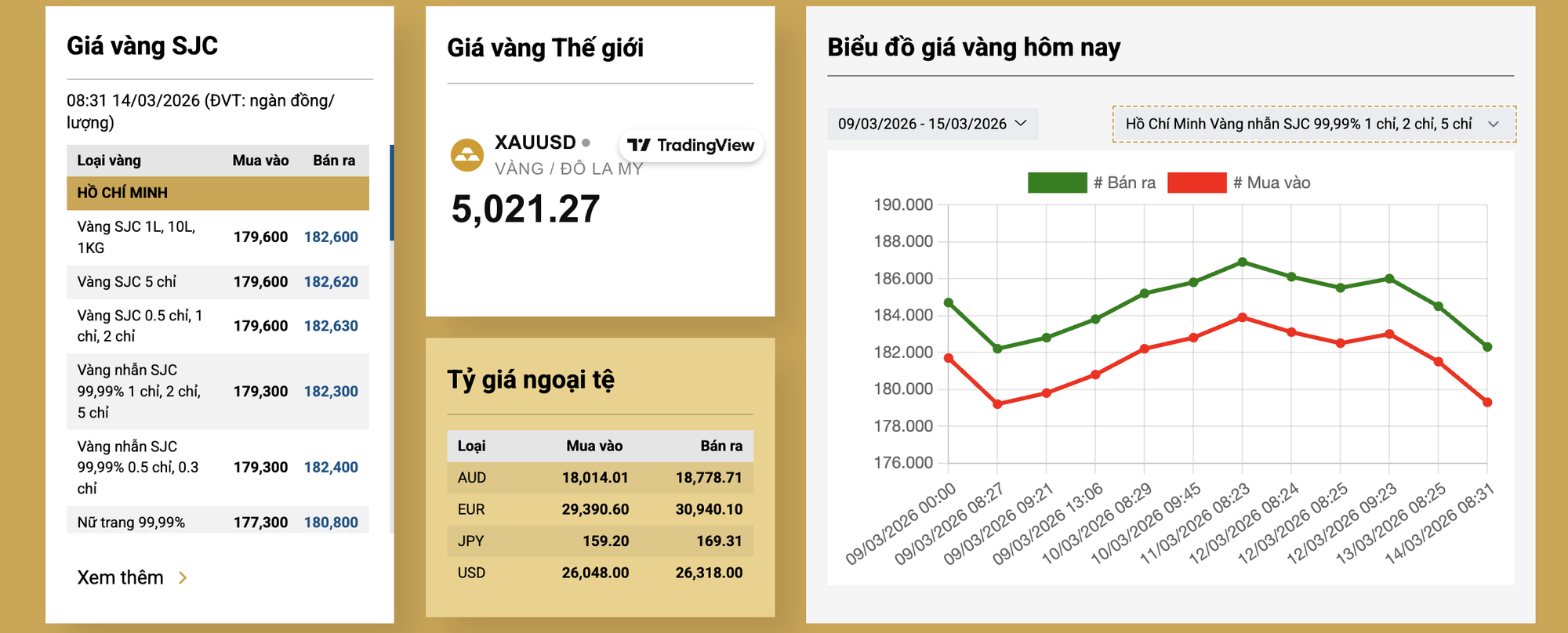 Đóng cửa tuần giao dịch 9/3 - 15/3, giá vàng miếng tại SJC, PNJ, DOJI, Bảo Tín Minh Châu và Bảo Tín Mạnh Hải cùng được niêm yết ở mức 179,6 – 182,6 triệu đồng/lượng (mua vào – bán ra).