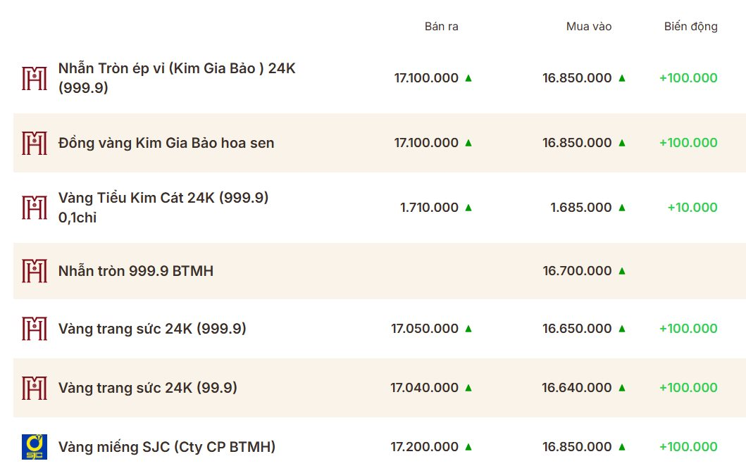 Trong khi đó, tại Bảo Tín Mạnh Hải, giá vàng miếng ở mức 168,5 – 172,0 triệu đồng/lượng. Vàng nhẫn trơn có giá 168,5 – 171,0 triệu đồng/lượng, đều tăng 1 triệu đồng/lượng.