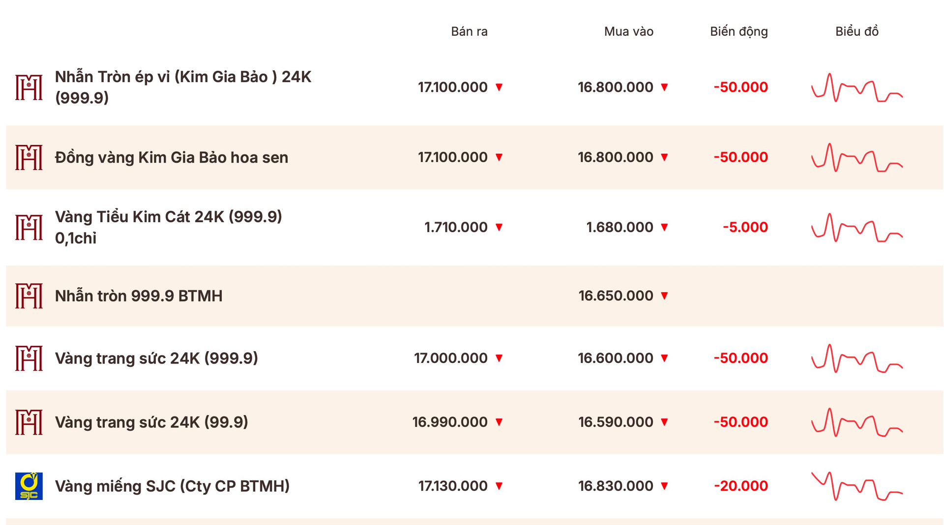 Đối với vàng nhẫn, SJC niêm yết 167,8 - 170,8 triệu đồng/lượng. Bảo Tín Minh Châu, Bảo Tín Mạnh Hải và Phú Quý cùng giao dịch ở mức 168 - 171 triệu đồng/lượng, trong khi DOJI niêm yết cao hơn, ở mức 168,3 - 171,3 triệu đồng/lượng. Mặt bằng giá vàng nhẫn đã giảm phổ biến 200.000-500.000 đồng/lượng trong với hôm qua.