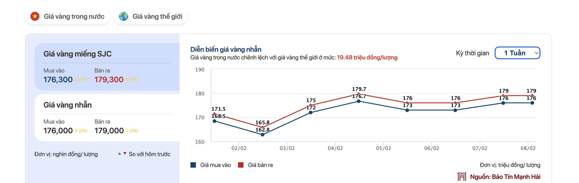 Ở phân khúc vàng nhẫn, SJC chào giá 175,8 – 178,8 triệu đồng/lượng, cao hơn 7,8 triệu đồng/lượng chiều mua vào và 7,3 triệu đồng/lượng chiều bán ra. PNJ và DOJI cùng niêm yết 176 – 179 triệu đồng/lượng, tăng 7,5 triệu đồng/lượng. Vàng nhẫn tại Bảo Tín Minh Châu và Bảo Tín Mạnh Hải được niêm yết ở mức 176,3 – 179,3 triệu đồng/lượng, tăng 7,3 triệu đồng/lượng so với cuối tuần trước.