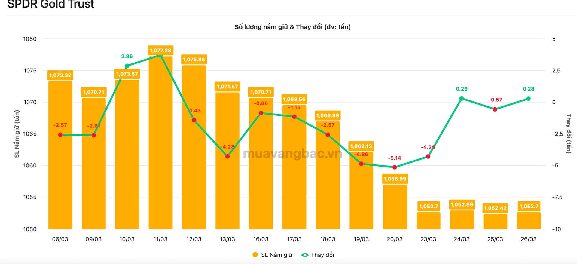 Theo cập nhật từ Muavangbac.vn, quỹ vàng lớn nhất thế giới SPDR Gold Trust mua ròng nhẹ gần 3 tạ vàng trong ngày 26/3. Sau chuỗi xả hàng liên tiếp từ phiên 12/3-23/3, quỹ này tỏ ra khá lưỡng lự khi liên tục đảo chiều trạng thái mua/bán với lực khá dè dặt. Hiện tại, SPDR còn nắm gần 1.053 tấn vàng.
