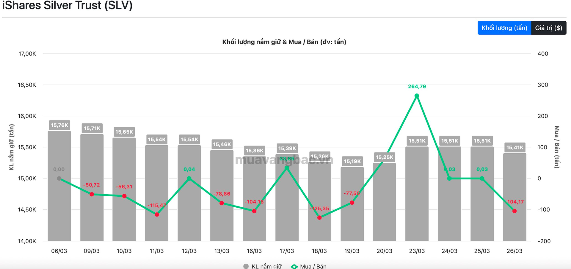 Trong khi đó, quỹ bạc lớn nhất thế giới iShare Silver Trust (SLV) bất ngờ bán ròng mạnh hơn 104 tấn bạc trong ngày 26/3.