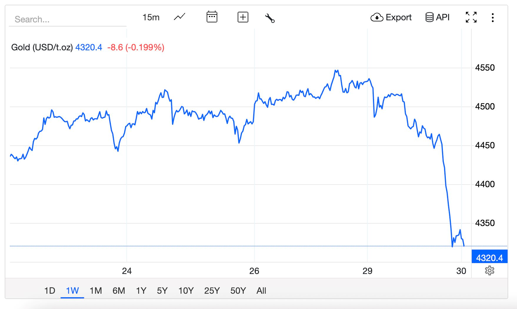 Trên thị trường quốc tế, giá vàng sáng cùng ngày có thời điểm vọt lên 4.540 USD/ounce, trước khi quay đầu đi xuống. Đến 0h40 ngày 30/12 theo giờ Hà Nội, vàng còn 4.320 USD/ounce. So với vài giờ trước đó, vàng có lúc mất tới hơn 230 USD/ounce. Đây là mức biến động rất lớn trong bối cảnh giá vàng thời gian qua liên tục lập đỉnh.
