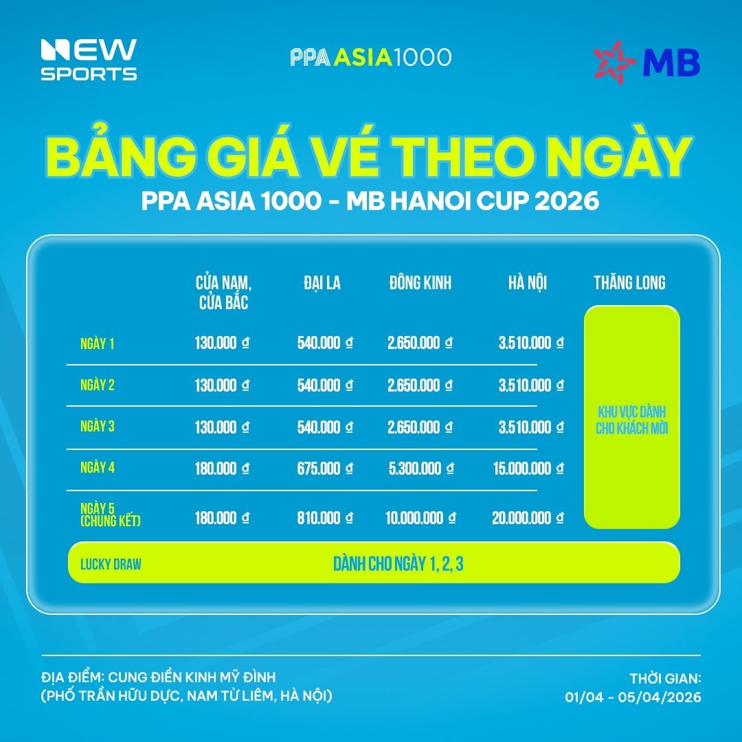 Theo ban tổ chức giải PPA Asia 1000 – MB Hanoi Cup 2026, hệ thống vé của giải đấu được mở bán với nhiều hạng khác nhau, dao động từ khoảng 130.000 đồng cho khu vực phổ thông như Cửa Nam, Cửa Bắc đến 20 triệu đồng/ngày cho hạng ghế VVIP Hà Nội trong những ngày thi đấu cao điểm. Đáng chú ý, toàn bộ vé cao cấp đã hết chỉ sau 1 giờ mở bán, cho thấy sức hút đặc biệt của sự kiện.
