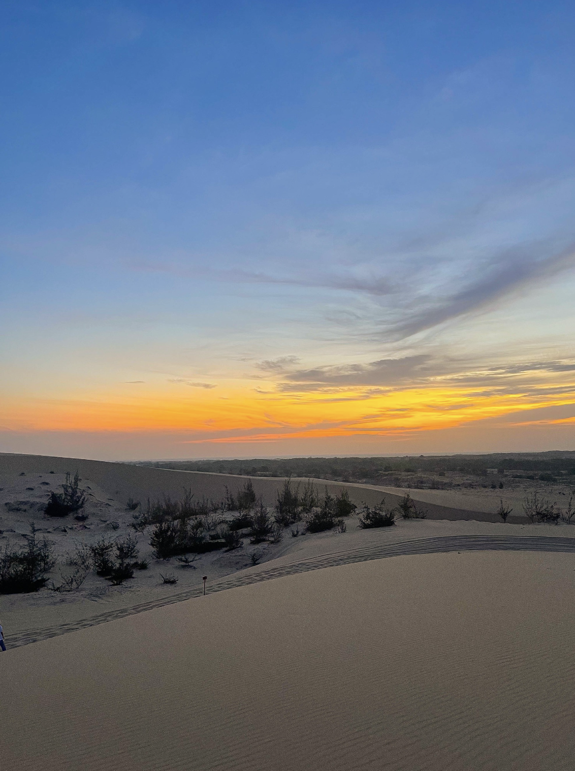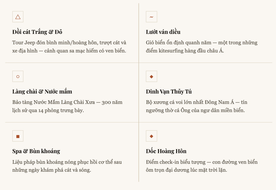 Góc lãng mạn và bay bổng (Romantasy Retreat): Khách du lịch có thể đắm chìm trong cảnh quan "sa mạc" hiếm có ven biển tại đồi cát Trắng và cát Đỏ, trải nghiệm tour xe Jeep đón bình minh, trượt cát hay chạy xe địa hình. Đặc biệt, Dốc Hoàng Hôn đang trở thành điểm check in biểu tượng với cung đường ven biển ôm trọn đại dương lúc mặt trời lặn.