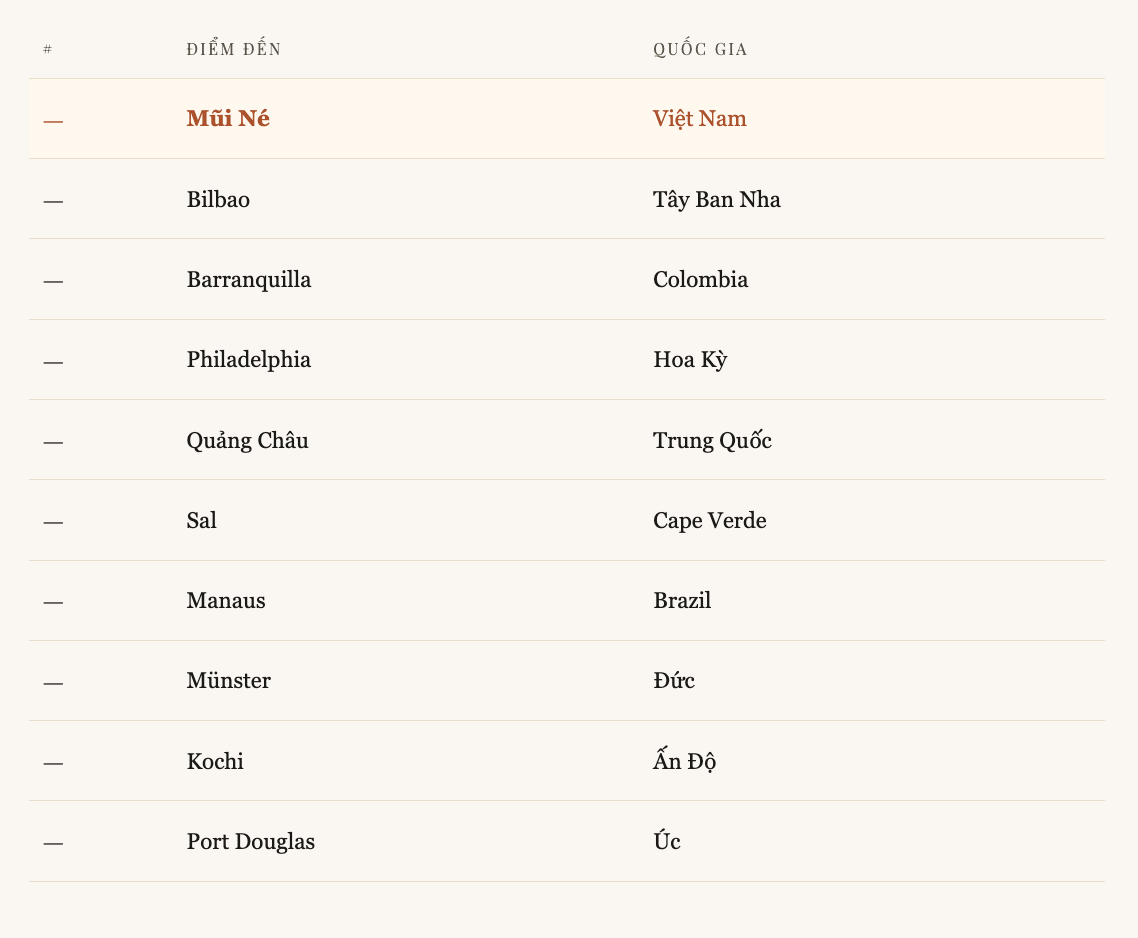 Danh sách 10 điểm đến xu hướng toàn cầu năm 2026 gọi tên: Mũi Né (Việt Nam), Bilbao (Tây Ban Nha), Barranquilla (Colombia), Philadelphia (Mỹ), Quảng Châu (Trung Quốc), Sal (Cape Verde), Manaus (Brazil), Münster (Đức), Kochi (Ấn Độ) và Port Douglas (Úc).