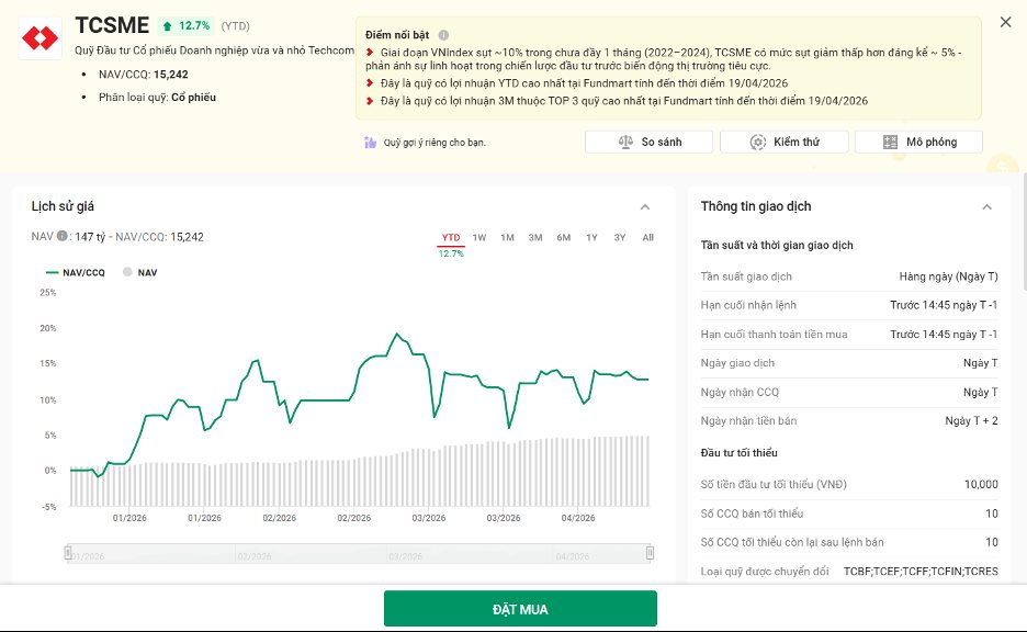 Quỹ TCSME và TCFF do Công ty Techcom Capital quản lý, hiện đang được phân phối trên Fundmart - nền tảng quy tụ 31 quỹ từ 14 công ty quản lý quỹ hàng đầu, chiếm gần 55% NAV quỹ mở nội địa, với hơn 180.000 lượt truy cập mỗi tuần và khoảng 45.000 nhà đầu tư đang sở hữu chứng chỉ quỹ.