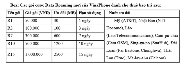 Theo đó, khách hàng sử dụng VinaPhone trả sau roaming đi Mỹ, Nhật Bản, Sing-ga-po, Đài Loan, Thái Lan, Ma-lay-si-a, Lào và Cam-pu-chia sẽ được giảm đến 99,7% giá cước sử dụng dịch vụ Data, cụ thể giảm từ 102.400đ/MB xuống còn 400đ/MB. Đặc biệt, tại Thái Lan, Cam-pu-chia, Lào, cước Data Roaming của VinaPhone rẻ gần ngang với mức cước của các nhà mạng thuộc nước sở tại. Đối với cước Data Roaming tại Mỹ, lần đầu tiên một nhà mạng Việt Nam thương thảo được mức cước thấp như vậy.