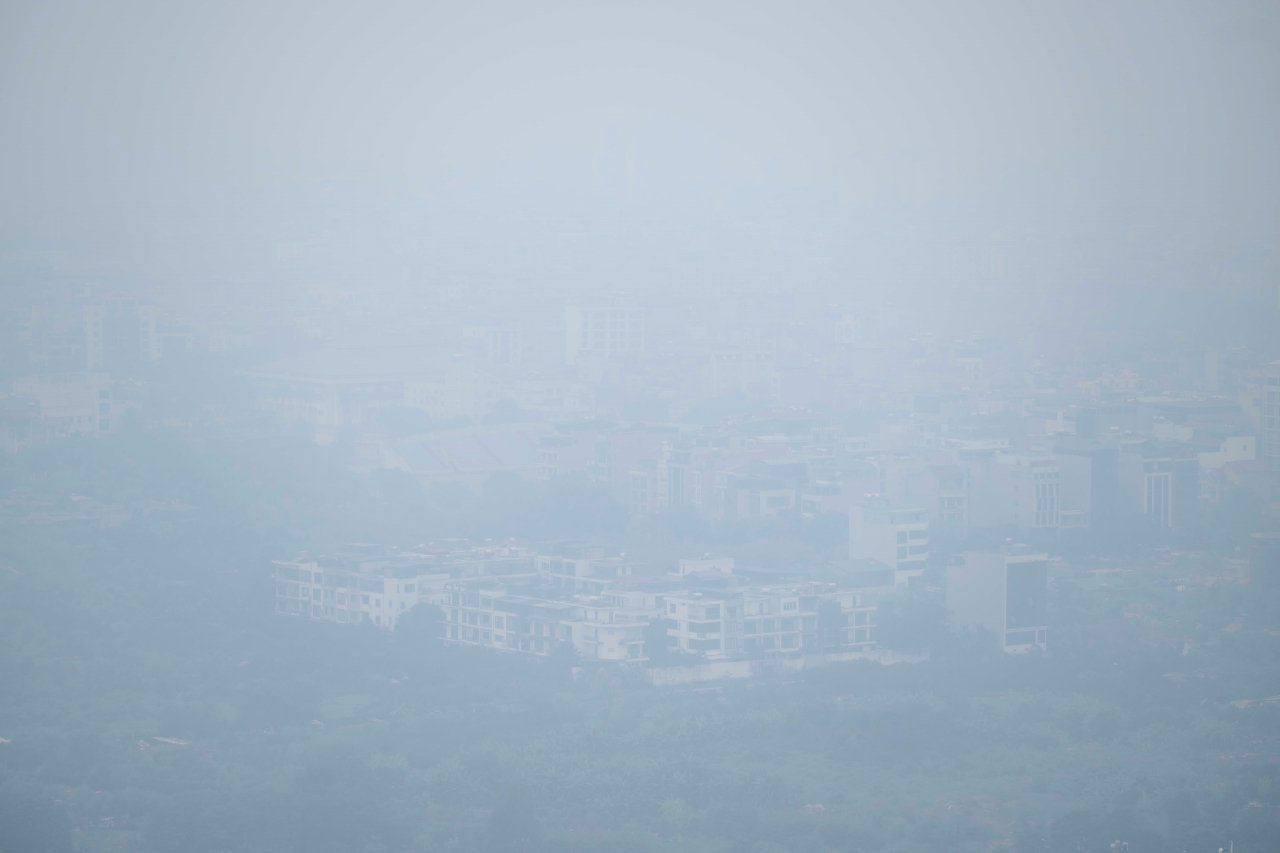 Dù đến giữa trưa, nhưng bầu trời thành phố như chìm trong màn sương xám đục khi bụi mịn dày đặc bao phủ khắp