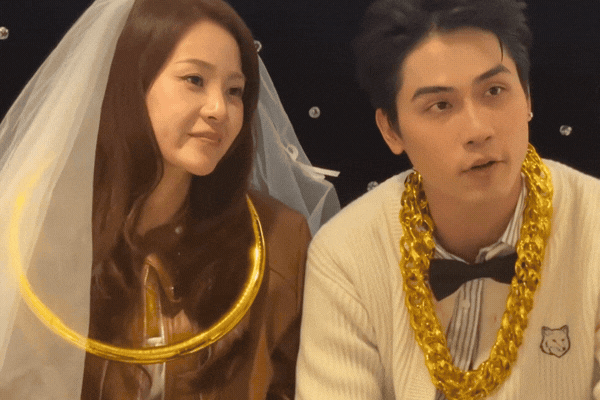 Điểm khiến dân tình bàn tán nhiều nhất chính là visual của cô dâu Tam Triều Dâng. Trong tạo hình đơn giản nhưng đủ đầy không khí "lên xe hoa", nữ diễn viên ghi điểm với vẻ ngoài rạng rỡ, dịu dàng, nụ cười tươi tắn khiến khung hình sáng bừng. Trong khi đó, chú rể Võ Điền Gia Huy lại khiến dân tình bật cười vì một chi tiết không thể “giả trân” hơn: sính lễ là những chiếc vòng vàng bản to, đeo kín cổ. Dù chỉ là đạo cụ mang tính tượng trưng, nhưng nhìn tổng thể vẫn tạo cảm giác “giàu nứt đố đổ vách”, đúng chuẩn chú rể miền Tây đi hỏi vợ. Chính chi tiết này càng khiến màn “đám cưới” trở nên duyên dáng, vừa hài hước vừa rất đúng tinh thần fan dành cho thần tượng.