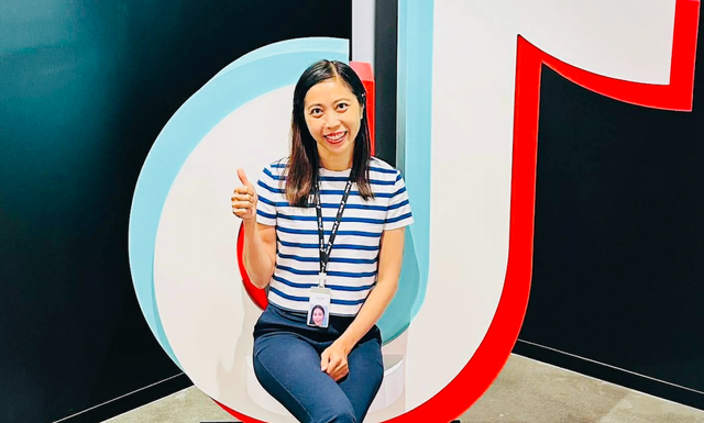 Cô gái Việt Mai Hồng Hạnh chụp ảnh tại trụ sở TikTok.