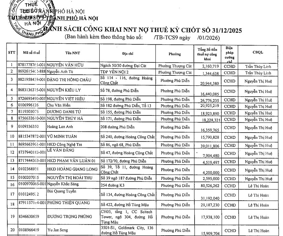Thuế cơ sở 9 Thành phố Hà Nội thực hiện công khai thông 41 người nộp thuế còn nợ tiền thuế và các khoản thu khác thuộc ngân sách nhà nước đến thời điểm khóa sổ 12/01/2026 với số tiền khoảng 548 triệu đồng.