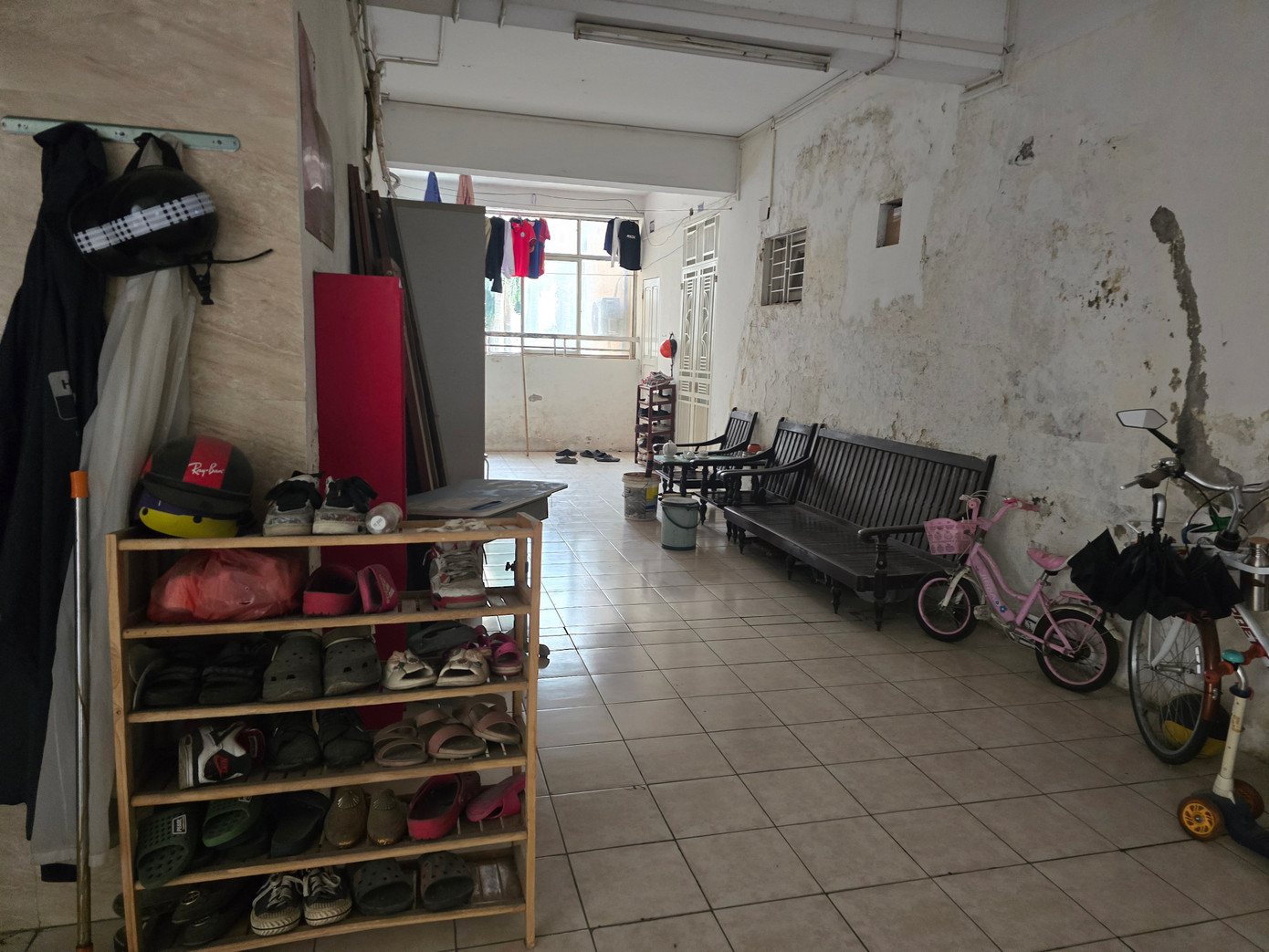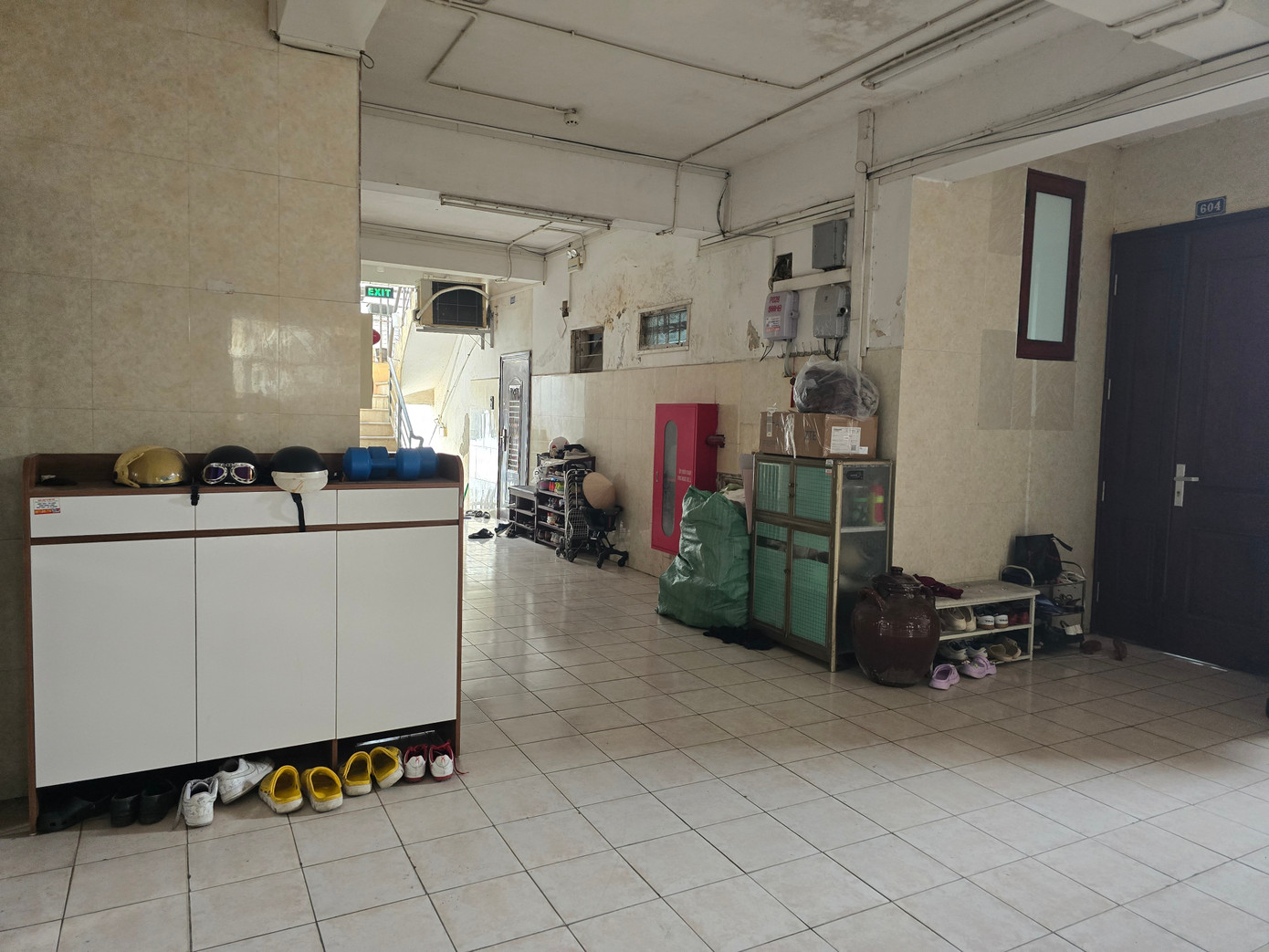 Tại tòa N3A đơn nguyên 1, hành lang các tầng 2,3,4, bị cư dân bày bàn ghế, xe đạp, tủ giày, ván gỗ, xe đạp, tủ hồ sơ giấy tờ.