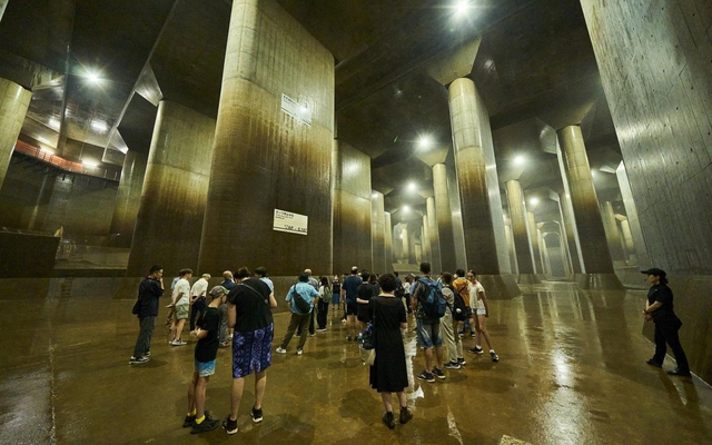 G-Cans hoàn thành năm 2006, dài 6,3 km, sâu 50–70 m, tổng dung tích khoảng 670.000 m³. Riêng bể chính Pantheon có kích thước tương đương khoảng 140 bể bơi Olympic, được chống đỡ bởi 59 trụ bê tông, mỗi trụ nặng khoảng 500 tấn để chịu áp lực nước khổng lồ. Ảnh: Bên trong hệ thống G-Cans.