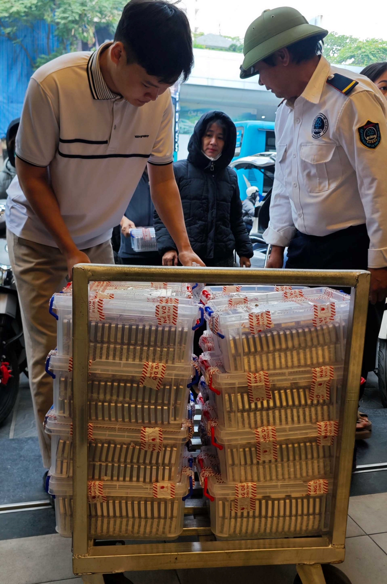 Từ khoảng 3 giờ sáng, vỉa hè trước cửa hàng đã chật kín người. Ai nấy đều khoác áo dày, quàng khăn kín cổ, tay cầm theo túi đồ ăn lót dạ trong lúc chờ đợi. Cái lạnh cắt da cắt thịt không ngăn được dòng người nối dài, trật tự xếp hàng để lấy phiếu mua bạc theo quy định của cửa hàng.