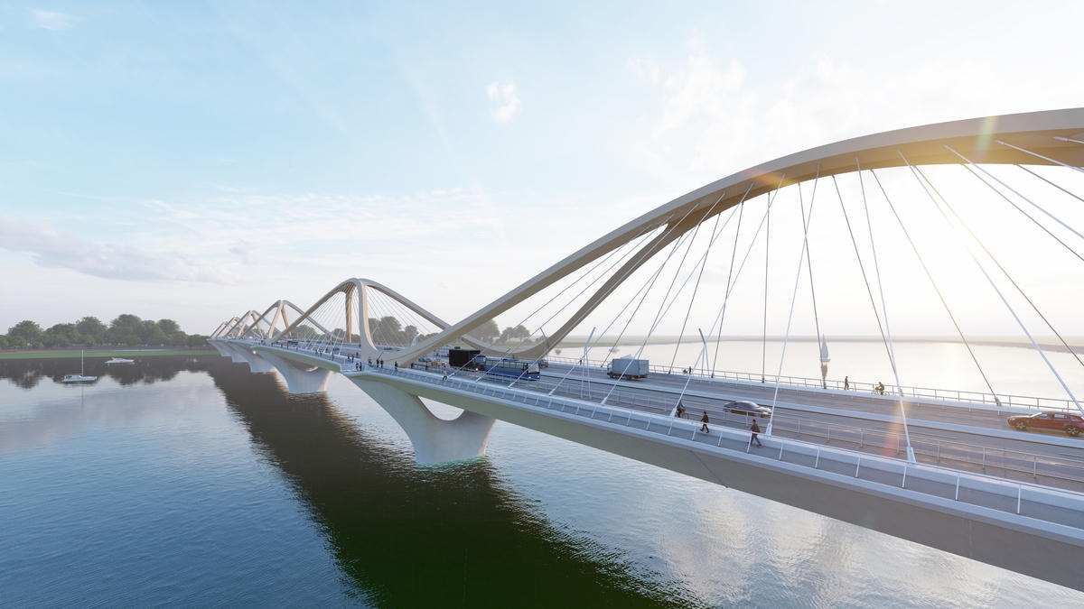 Trong đó, cầu chính vượt sông Hồng được xây dựng theo tiêu chuẩn thiết kế cầu hiện hành; kết cấu cầu chính dạng vòm thép, hình dáng vòm chính là hai đường cong tiếp xúc nhau lặp lại, tạo hình mang biểu tượng vô cực; sơ đồ nhịp 6 x 145 m (2 liên x 3 nhịp liên tục), chiều dài cầu chính 870 m, quy mô mặt cắt ngang khoảng 43 m, bảo đảm 6 làn xe cơ giới, 2 làn xe đạp, 2 làn đi bộ.