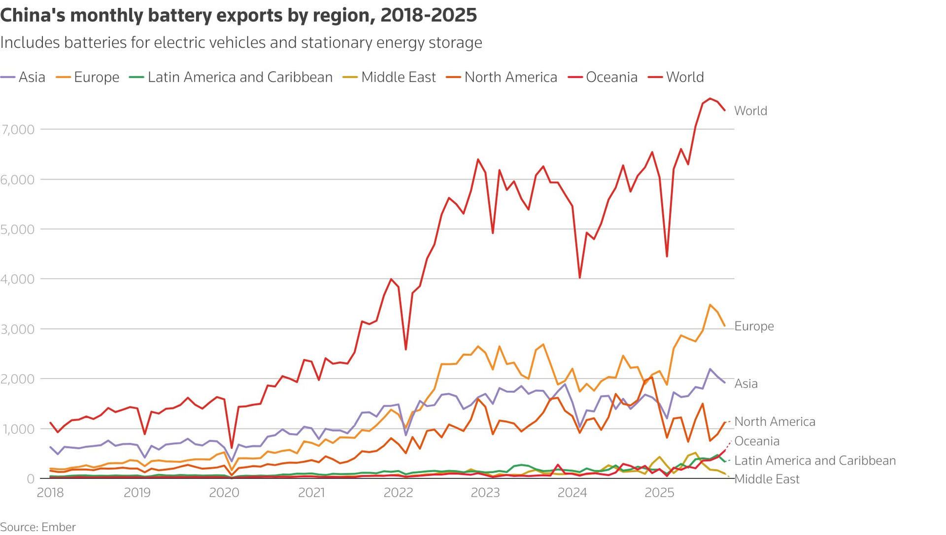 Xuất khẩu pin hàng năm của Trung Quốc theo khu vực, giai đoạn 2018-2025.