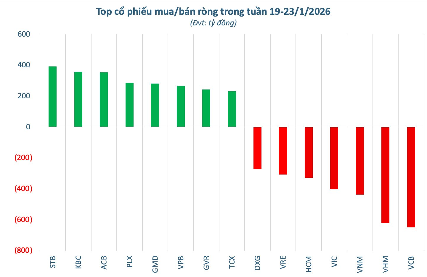 Thống kê theo các mã chứng khoán, VCB là cổ phiếu bị bán ròng mạnh nhất trong tuần với giá trị 650 tỷ đồng, dẫn đầu nhóm chịu áp lực rút vốn từ khối ngoại. Theo sau là VHM (-623 tỷ đồng) và VNM (-438 tỷ đồng). Áp lực bán ròng cũng ghi nhận rõ tại các mã VIC (-402 tỷ đồng), HCM (-328 tỷ đồng), VRE (-307 tỷ đồng) và DXG (-273 tỷ đồng).
