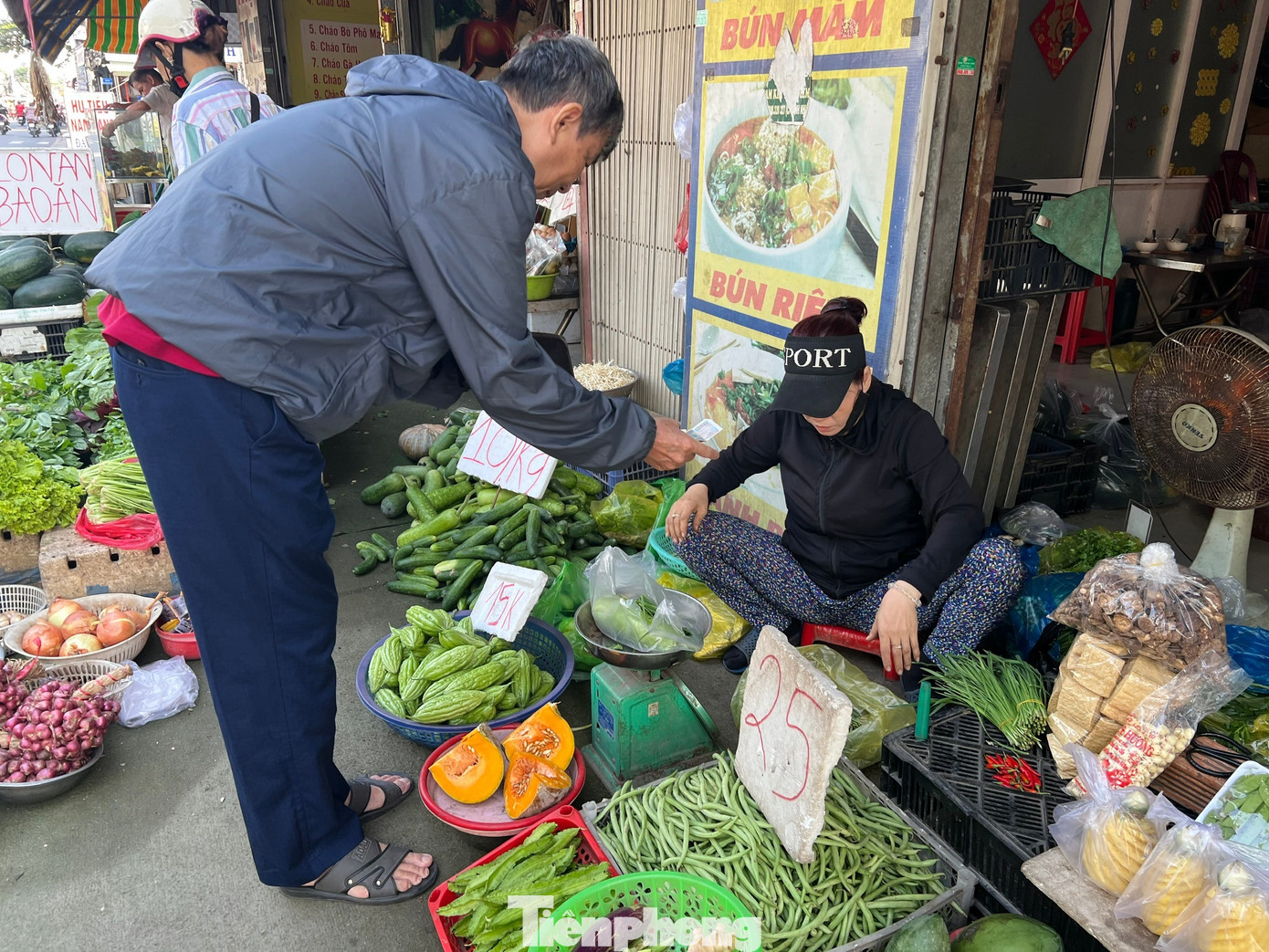Đổ một sọt dưa leo ra chiếc rổ lớn để khách dễ lựa chọn, bà Tư (tiểu thương chợ Phú Lâm, phường Phú Lâm) cắm chiếc bảng lớn “dưa leo non 10K”, đồng thời bật chiếc loa mini nêu loạt rau củ chỉ 10.000 đồng/kg như bầu, bí, bắp cải…