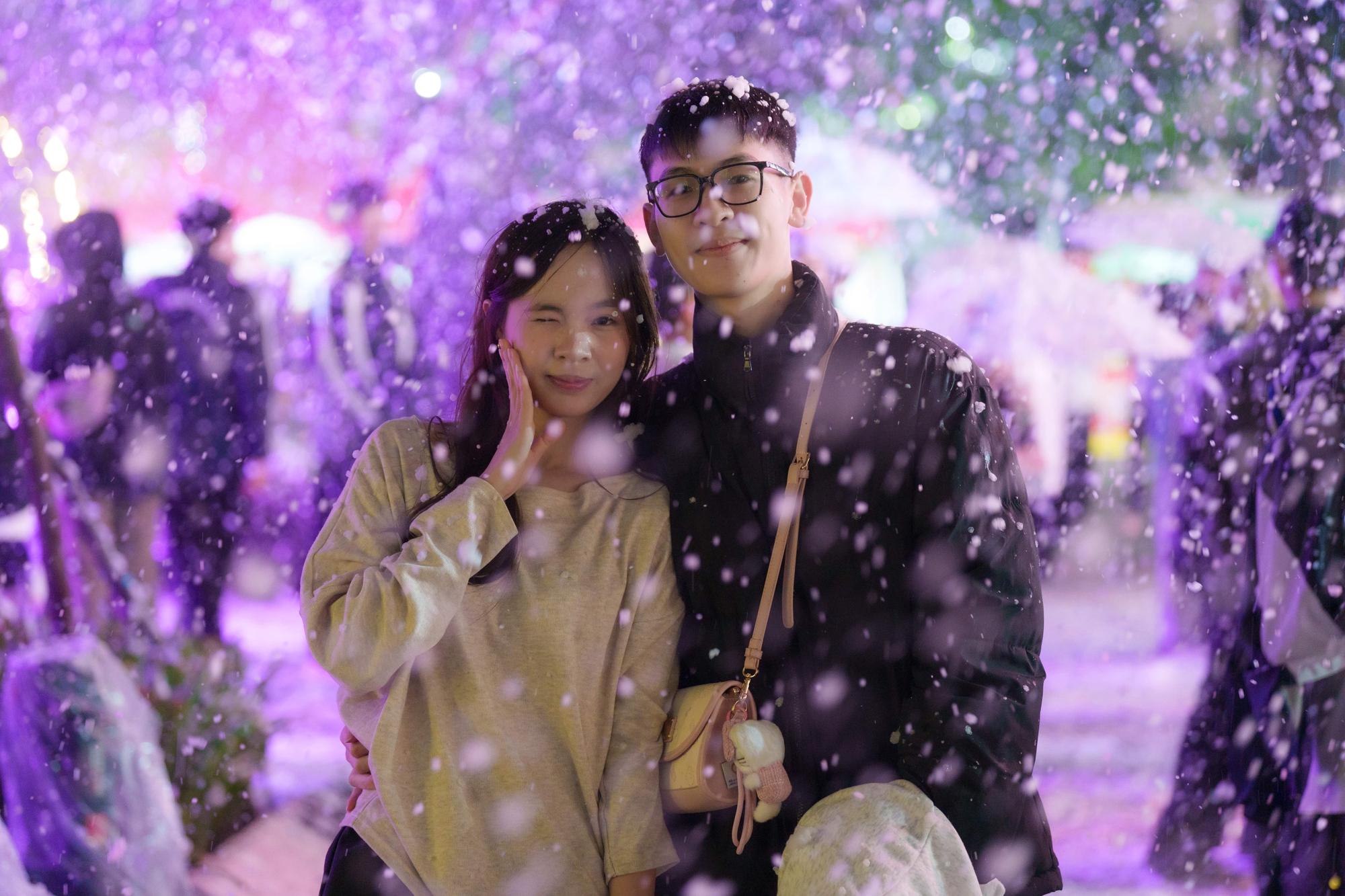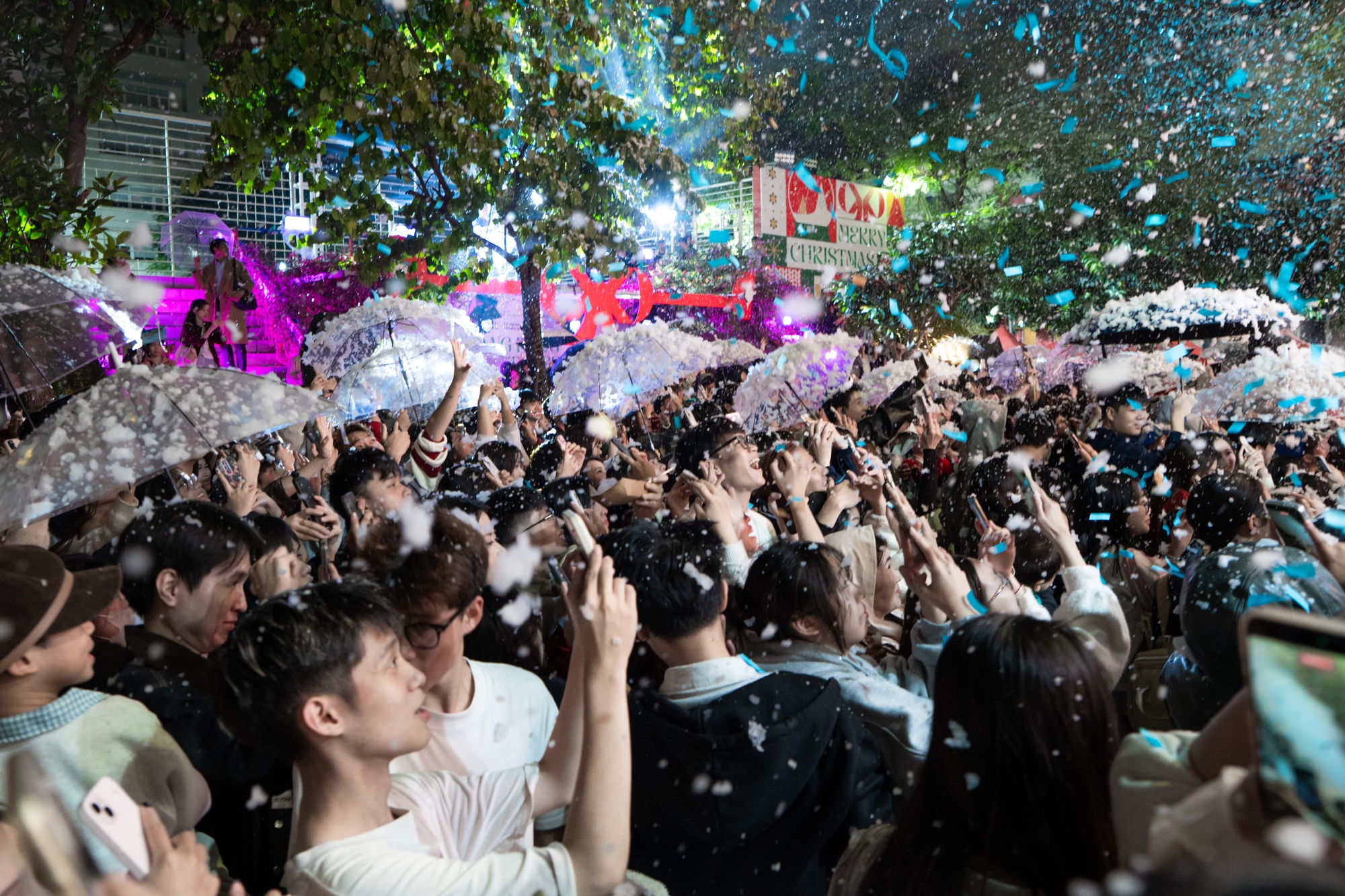 Điểm nhấn luôn được trông đợi của sự kiện là khu vực cây thông Noel khổng lồ cao gần 15m cùng màn trình diễn phun tuyết và bắn pháo hoa rực rỡ kéo dài gần 1 tiếng. Máy phun tuyết được đặt trên đỉnh cây thông khổng lồ, tạo ra những cơn “mưa tuyết” phủ trắng xóa khuôn viên trường. Đứng dưới cây thông Noel rực rỡ cùng làn tuyết rơi, ai cũng thích thú như lạc vào không gian Giáng sinh nơi trời Âu. Từ các cặp đôi yêu nhau đến những gia đình trẻ, nhóm bạn thân thiết, ai cũng chọn cho mình một góc check-in để cùng nhau lưu lại những khoảnh khắc ý nghĩa trong mùa lễ hội này.