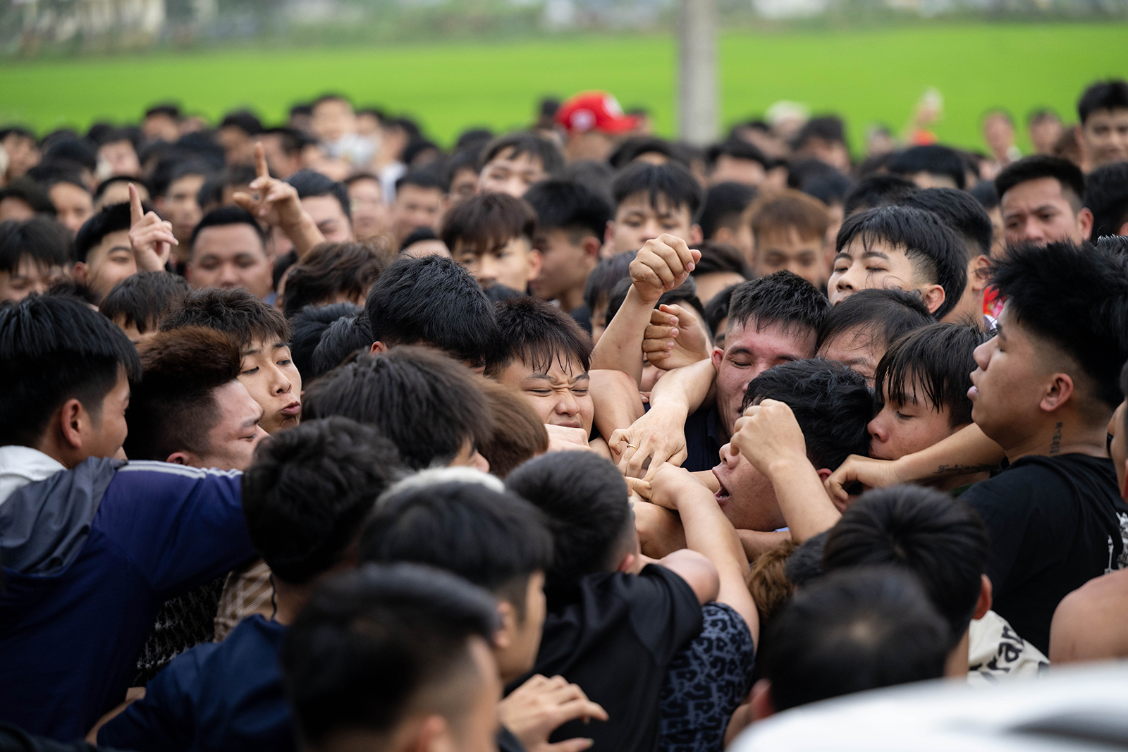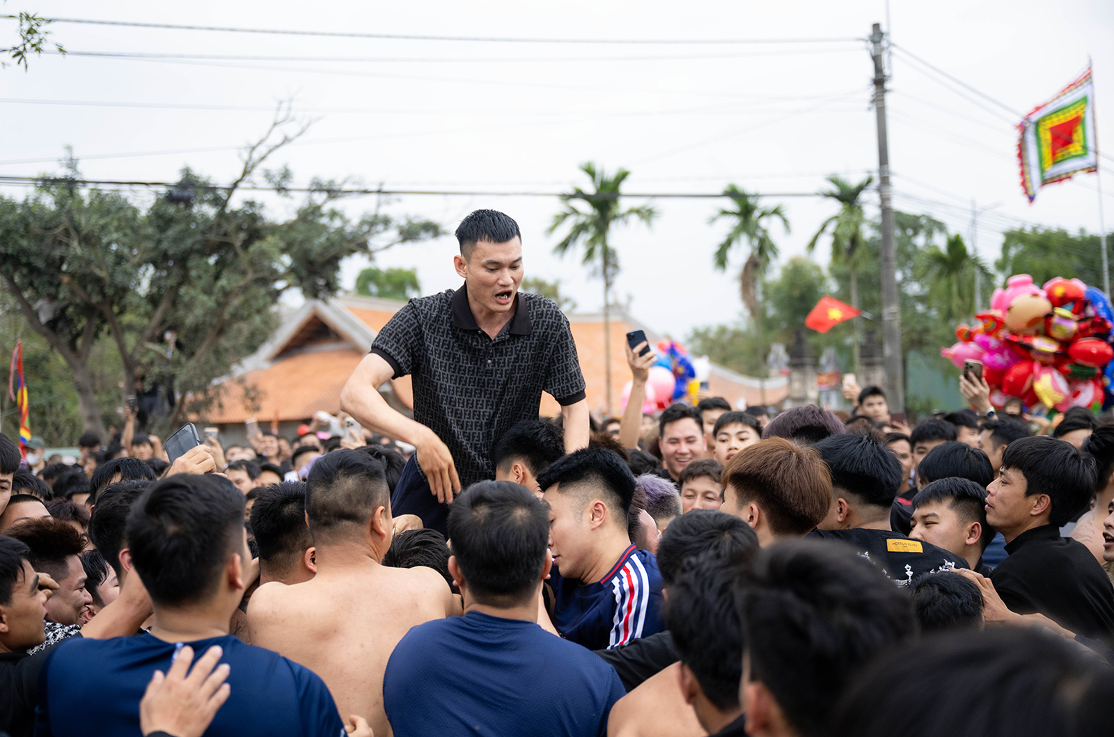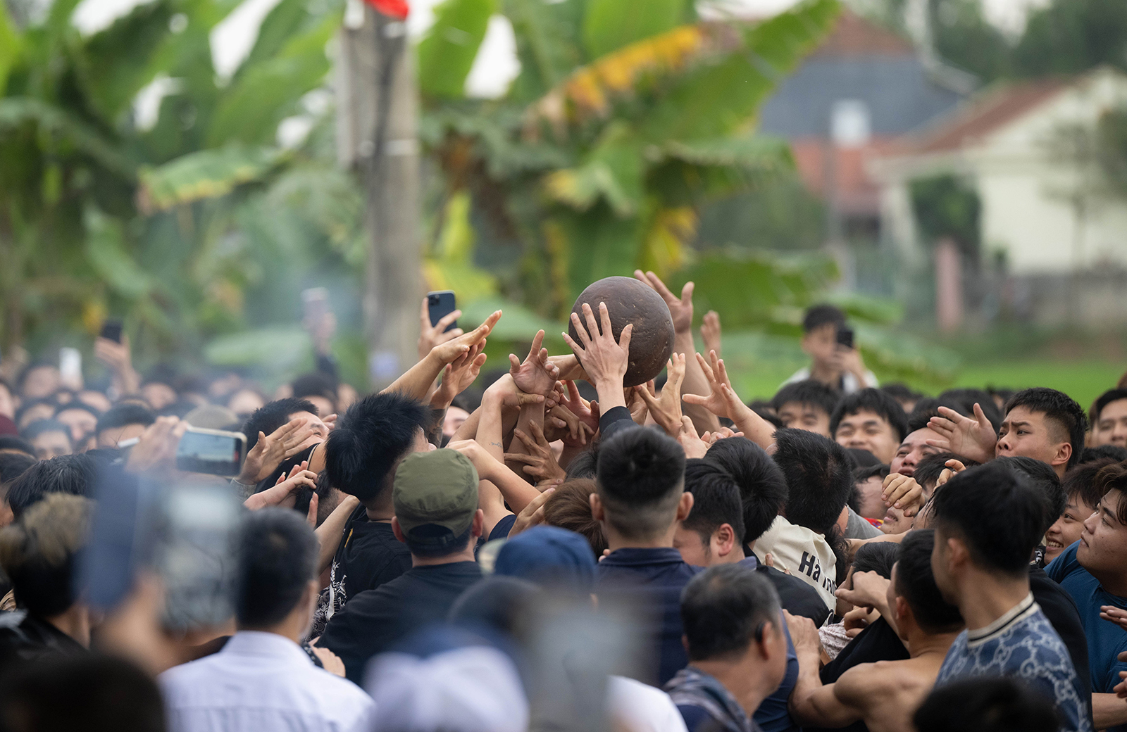 Hàng trăm thanh niên lao vào tranh cướp quả phết giữa sân đình trong tiếng reo hò náo nhiệt. Màn giằng co quyết liệt diễn ra với mong muốn chạm tay vào “lộc” đầu năm, cầu may mắn và bình an.