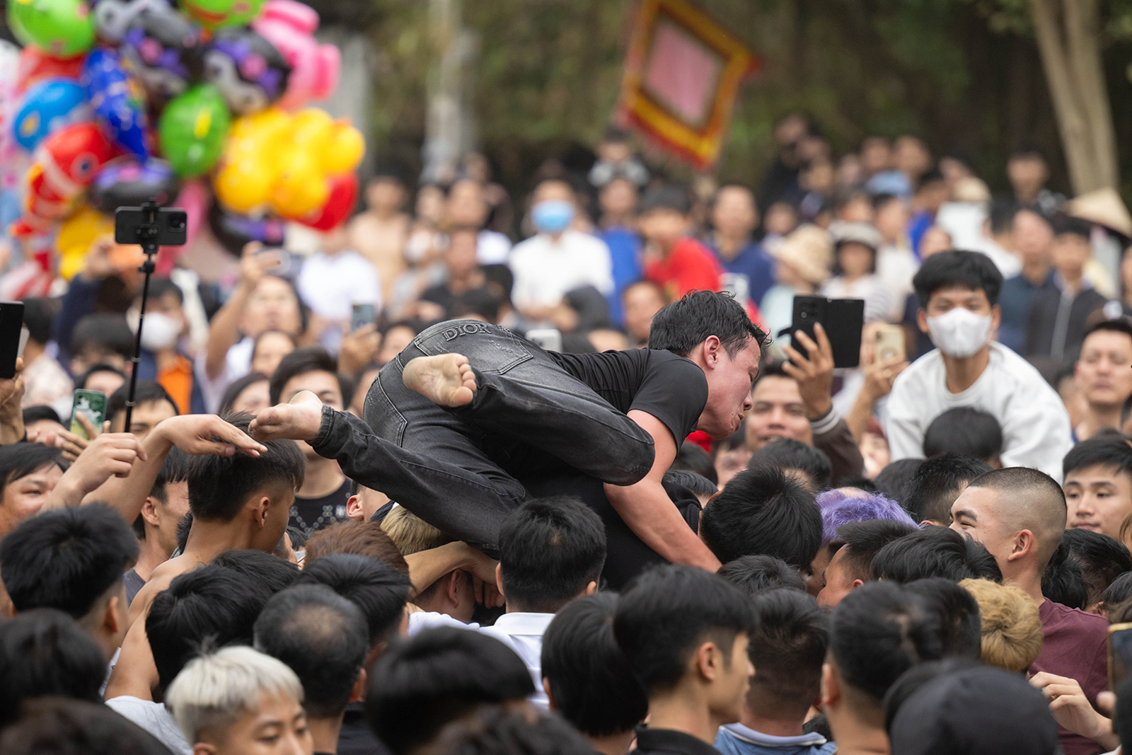 Với mong muốn chạm được vào quả phết để cầu may, nhiều người sẵn sàng chen lấn, leo trèo, thậm chí giẫm lên nhau giữa đám đông.