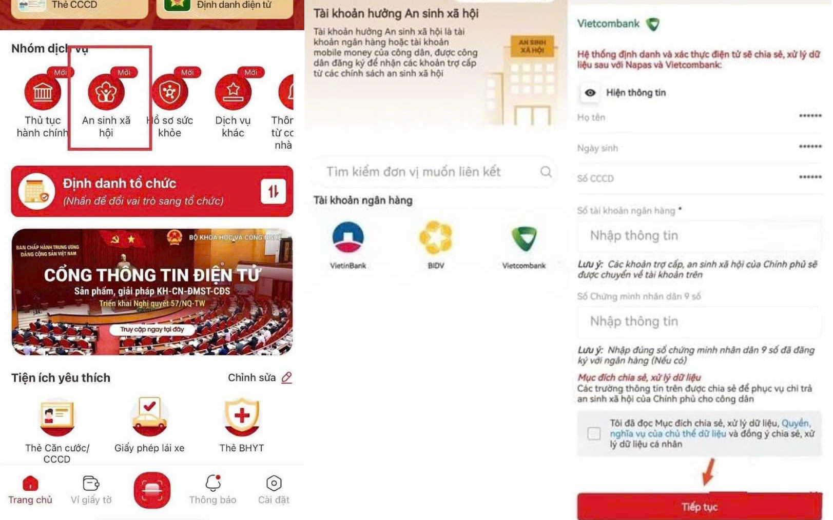 Các bước đăng ký Tài khoản an sinh xã hội trên VNeID Bước 1: Đăng nhập VNeID: Mở ứng dụng, đăng nhập tài khoản định danh điện tử (mức độ 2). Bước 2: Chọn mục An sinh xã hội: Chọn vào mục "An sinh xã hội" > "Tài khoản hưởng An sinh xã hội". Bước 3: Chọn ngân hàng/ví điện tử: Chọn ngân hàng bạn muốn nhận tiền (Vietcombank, BIDV, VietinBank, MB...). Bước 4: Nhập thông tin: Nhập số tài khoản ngân hàng/ví điện tử, điền đầy đủ thông tin cá nhân và đồng ý chia sẻ dữ liệu. Bước 5: Gửi yêu cầu: Xác nhận và gửi yêu cầu, chờ kết quả xét duyệt từ VNeID. |