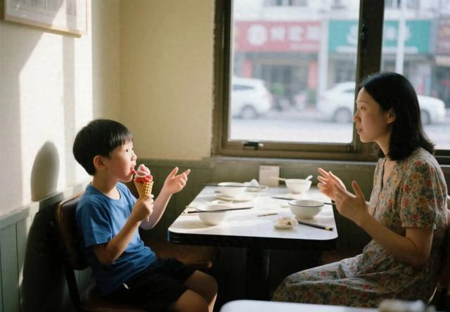 Tôi quay theo ánh mắt của cô ấy và thấy cậu bé đang cầm que kem, vừa ăn vừa hỏi mẹ: "Nếu con ăn một nửa que kem bây giờ, thì nửa còn lại sẽ tan nhanh hơn nguyên cây đúng không mẹ?".