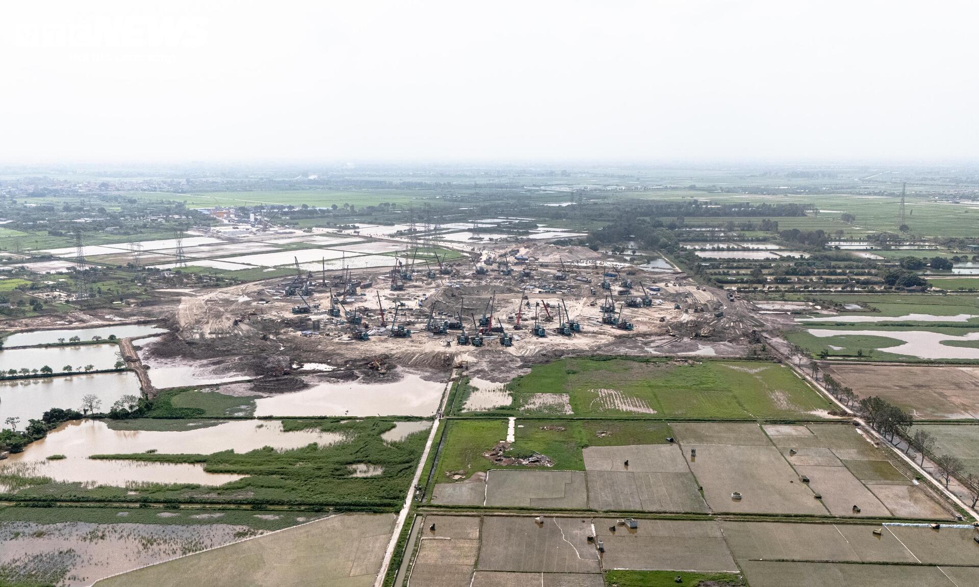 Tại nhiều vị trí, công nhân đang triển khai các hạng mục đào đắp, hạ cốt nền và san phẳng mặt bằng.