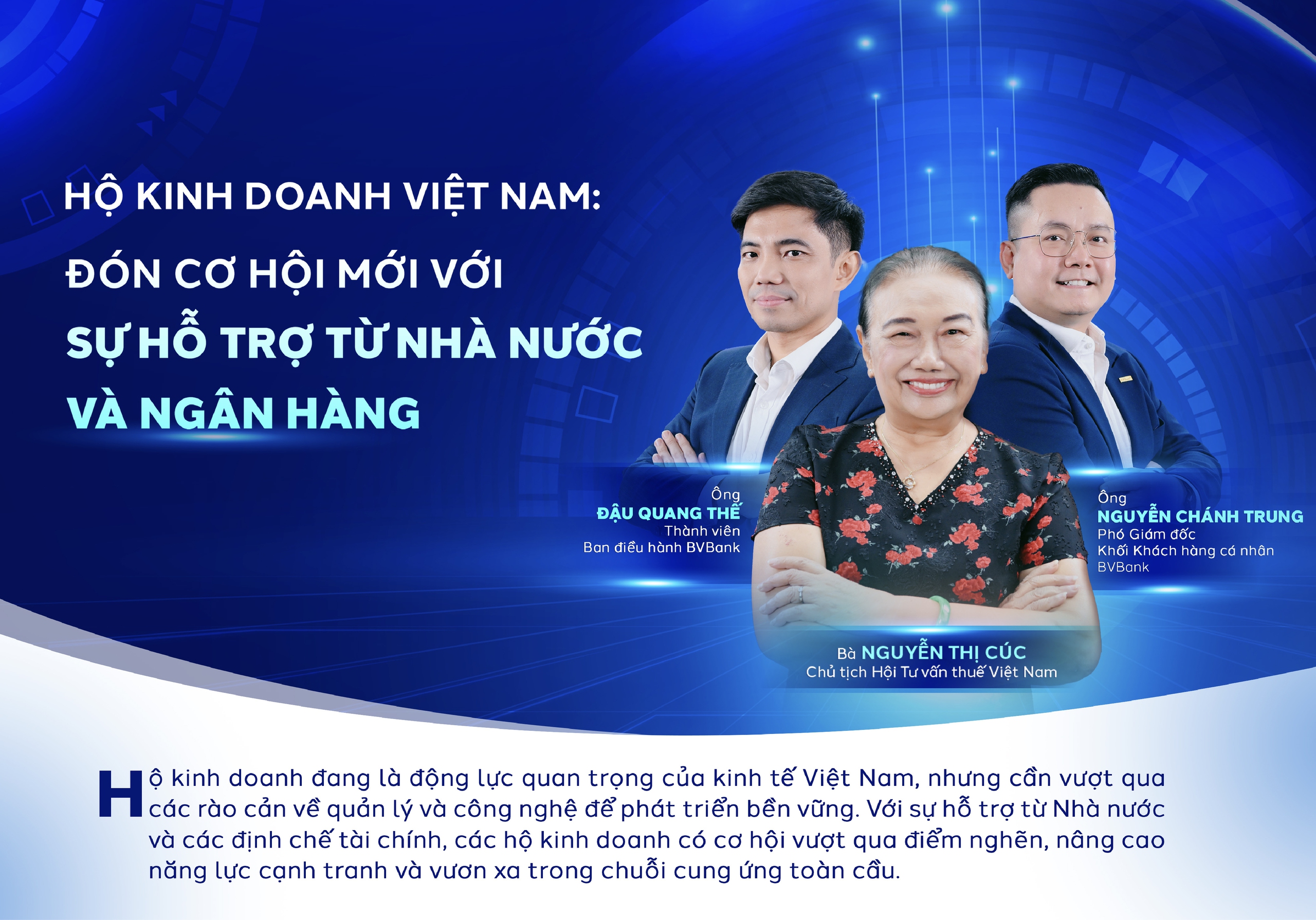 Để làm rõ hơn bức tranh này, CafeF phối hợp cùng Ngân hàng Thương mại Cổ phần Bản Việt (BVBank) tổ chức talkshow với chủ đề "Tháo gỡ điểm nghẽn, đón cơ hội cùng hộ kinh doanh". Talkshow có sự góp mặt của ba vị khách mời đặc biệt: bà Nguyễn Thị Cúc – Chuyên gia cao cấp về thuế, Chủ tịch Hội Tư vấn Thuế Việt Nam, ông Đậu Quang Thế – Thành viên Ban Điều hành kiêm Giám đốc Khối Khách hàng Cá nhân BVBank và ông Nguyễn Chánh Trung – Phó Giám đốc Khối Khách hàng Cá nhân BVBank với sự dẫn dắt bởi MC Phùng Ánh.
