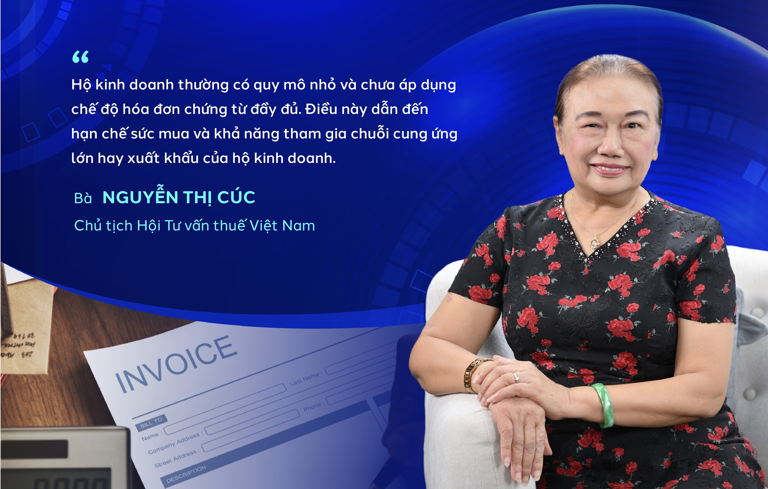 Bà Nguyễn Thị Cúc: Hộ kinh doanh thường có quy mô nhỏ và chưa áp dụng chế độ hóa đơn chứng từ đầy đủ. Với các doanh nghiệp, hàng hóa đầu vào có hóa đơn giá trị gia tăng giúp khách hàng được khấu trừ thuế, nhưng với hộ kinh doanh không có hóa đơn, người mua khó đưa vào chi phí. Điều này dẫn đến hạn chế sức mua và khả năng tham gia chuỗi cung ứng lớn hay xuất khẩu của hộ kinh doanh. Điều này cũng khiến ngân hàng e ngại rủi ro khi cho vay do thiếu minh bạch về doanh thu, địa chỉ, hay cơ sở vật chất. Để khắc phục, hộ kinh doanh cần thay đổi tư duy, áp dụng phần mềm kế toán, quản lý dòng tiền hiệu quả và tận dụng chính sách hỗ trợ từ Nhà nước.