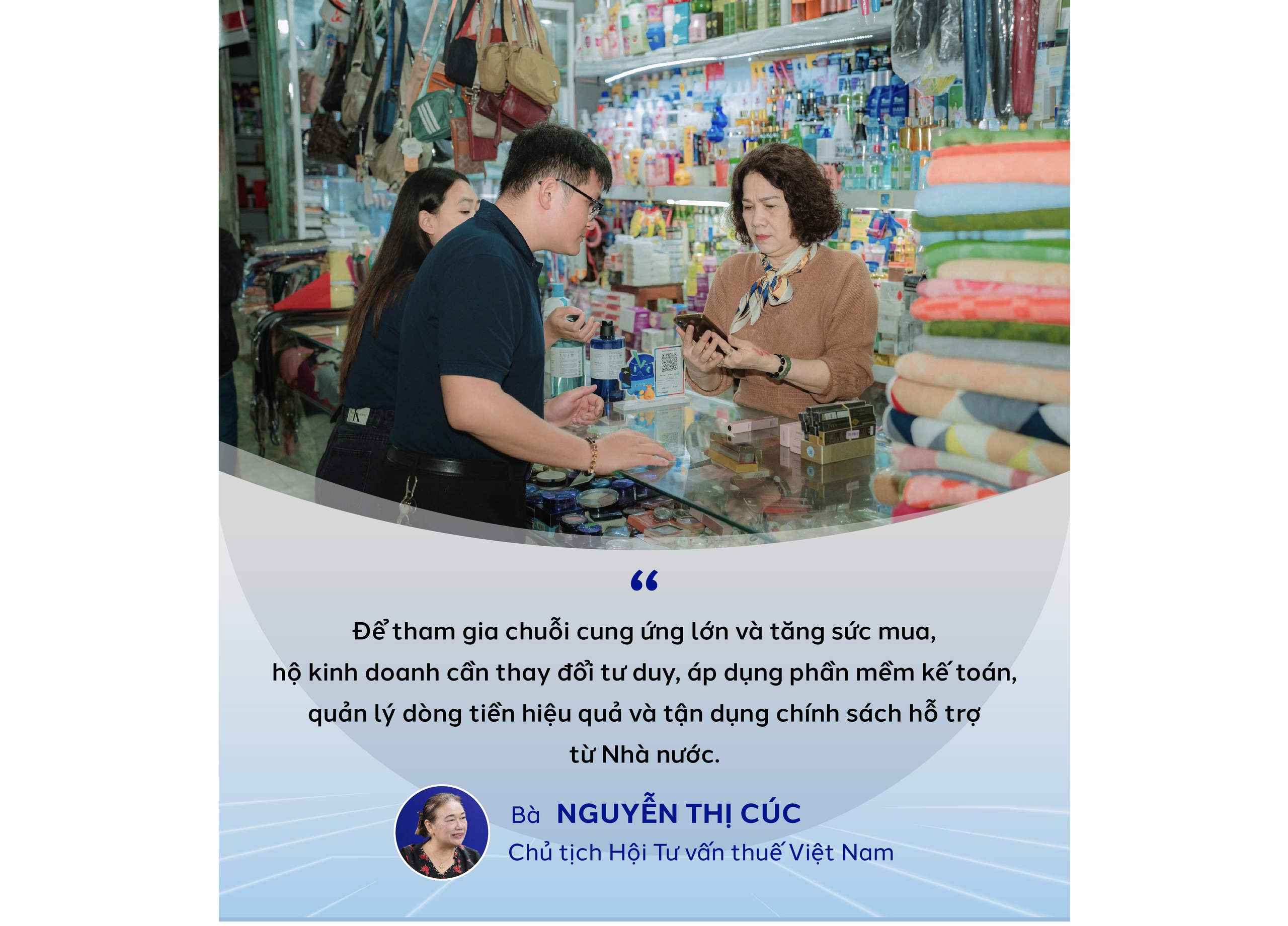 Bà Nguyễn Thị Cúc: Tôi khuyến khích hộ kinh doanh cân nhắc chuyển đổi thành doanh nghiệp. Khi áp dụng thuế giá trị gia tăng, hàng hóa của họ được chấp nhận trong chuỗi cung ứng, chi phí đầu tư được hạch toán, lỗ được chuyển 5 năm và có thể miễn thuế thu nhập doanh nghiệp. Chuyển đổi giúp nâng cao vị thế, doanh thu và khả năng kết nối trong nước lẫn trên trường quốc tế.