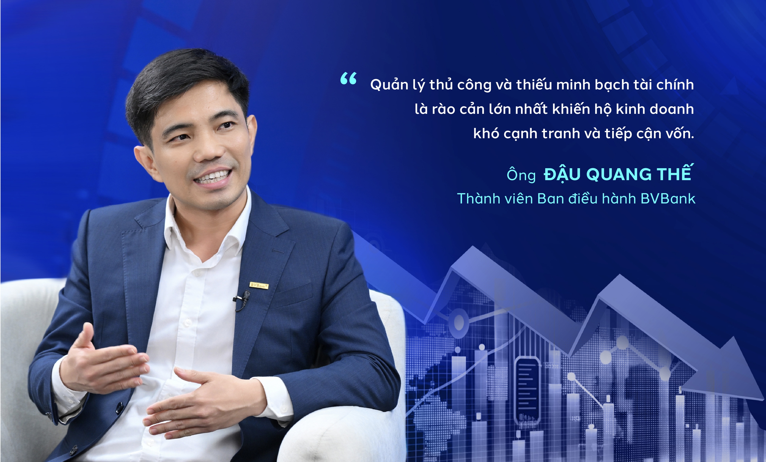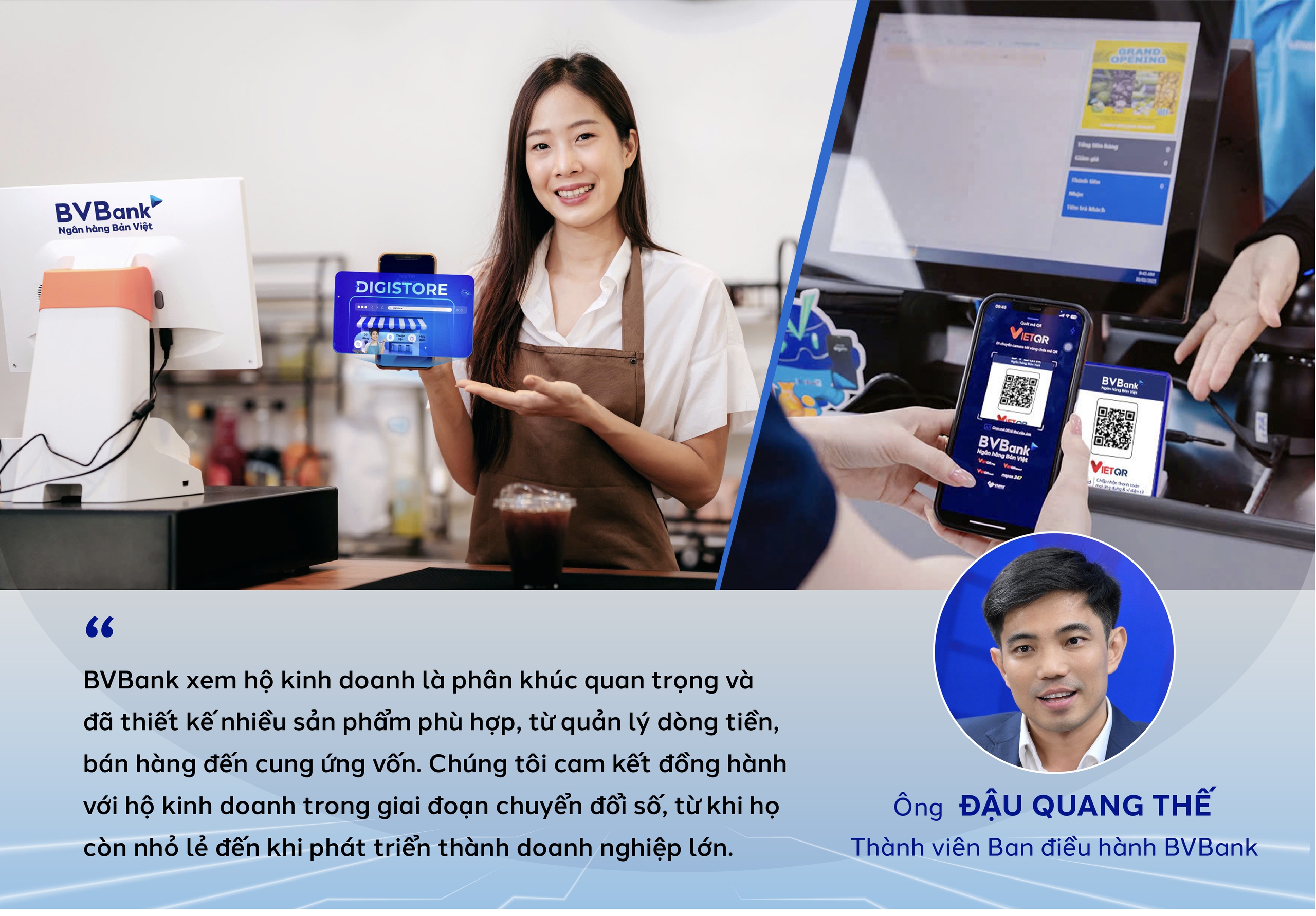 Ông Đậu Quang Thế:Từ phía BVBank, chúng tôi xem hộ kinh doanh là phân khúc quan trọng và đã thiết kế nhiều sản phẩm phù hợp. Cụ thể, chúng tôi cung cấp giải pháp tích hợp quản lý dòng tiền, bán hàng, vật tư và khách hàng trong một ứng dụng duy nhất, giúp đơn giản hóa quy trình.