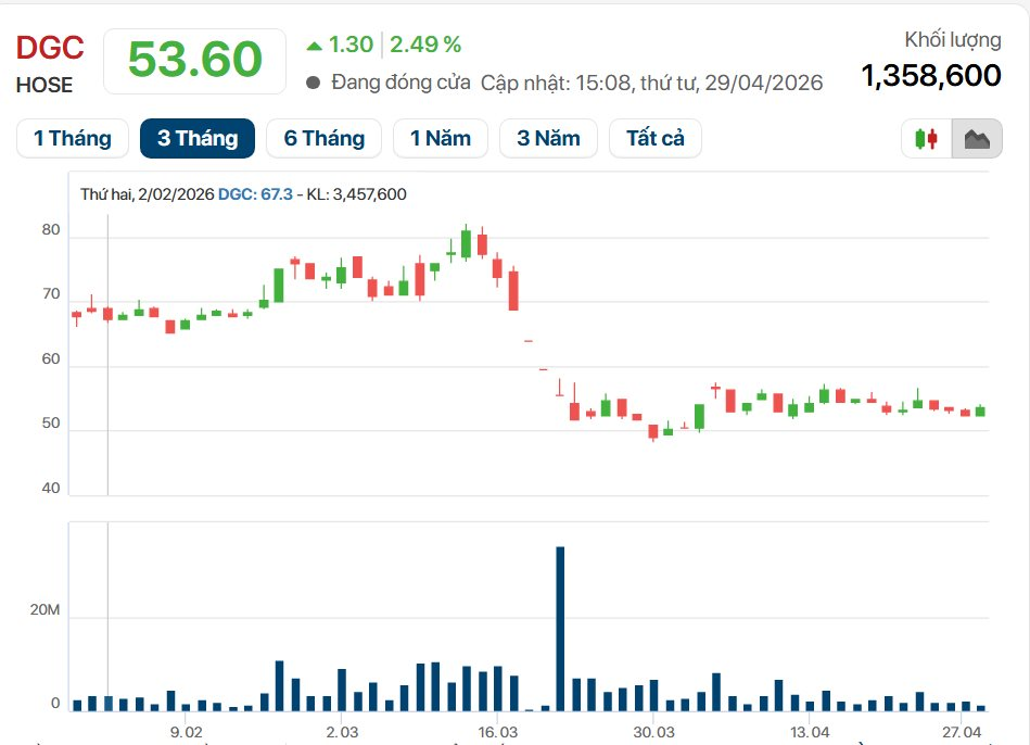 Trên thị trường chứng khoán, cổ phiếu DGC kết thúc phiên giao dịch ngày 29/04/2026 tại mức giá 53.600 đồng, ghi nhận sự hồi phục nhẹ 2,49% với khối lượng giao dịch 1,3 triệu đơn vị.