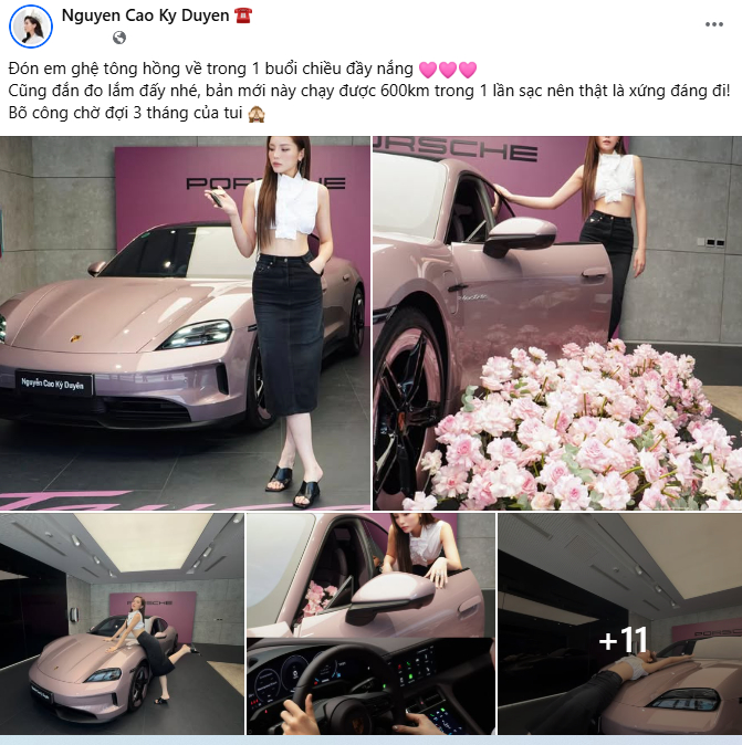 Hoa hậu Nguyễn Cao Kỳ Duyên tiếp tục khiến cộng đồng mạng bàn tán khi chia sẻ khoảnh khắc nhận chiếc Porsche Taycan màu Frozenberry Metallic đầy nổi bật. Trong bài đăng trên mạng xã hội, người đẹp cho biết cô đã chờ đợi khoảng 3 tháng để đón được chiếc xe yêu thích về dinh. Đồng thời, cô tiết lộ chiếc xe có thể di chuyển khoảng 600 km chỉ sau một lần sạc, chi tiết này góp phần khiến màn “lên đời” xe mới của cô càng được chú ý.