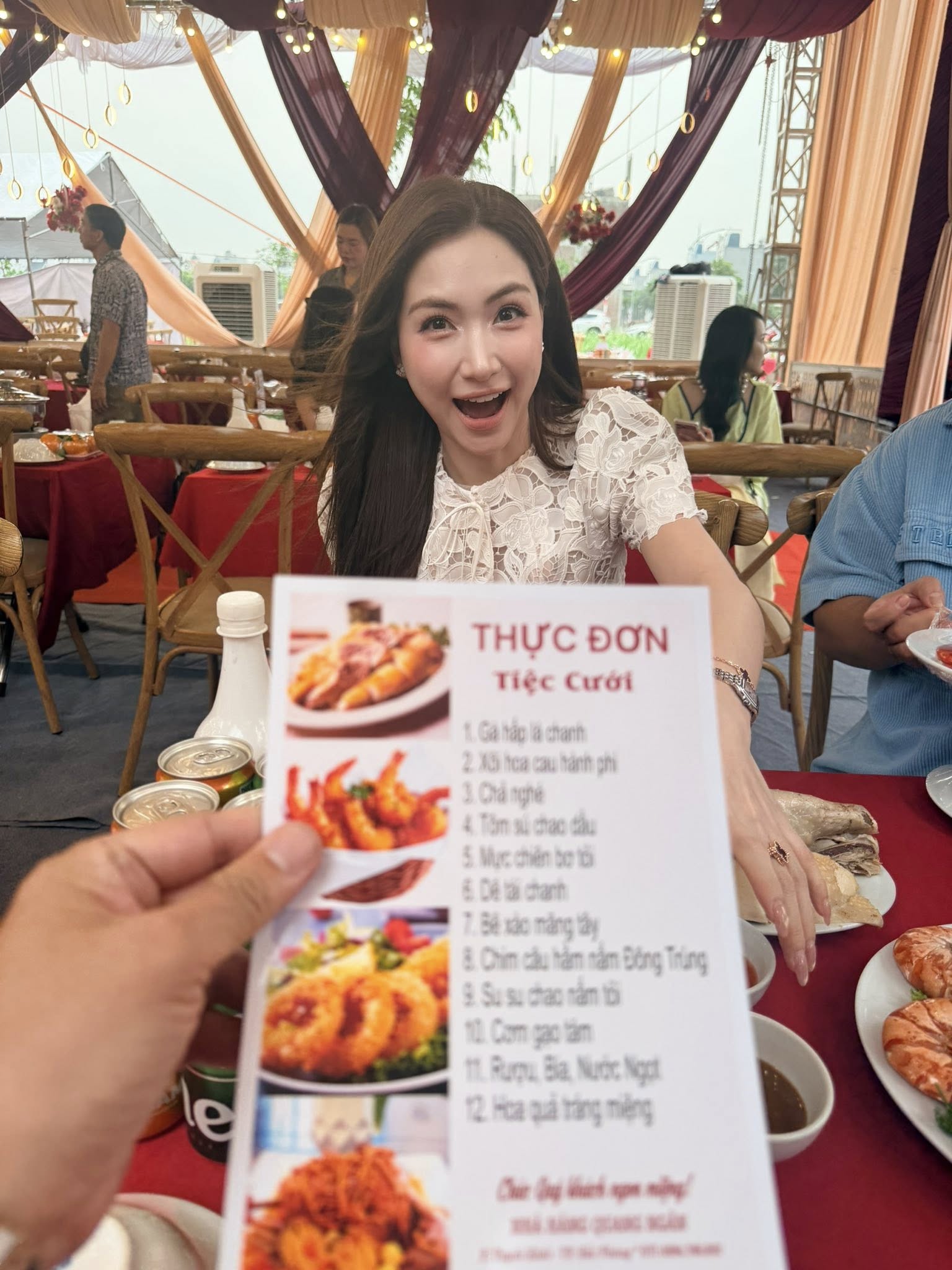 Hoà Minzy với vẻ mặt tấu hài khi dùng cỗ cưới (Ảnh: Dương Trọng Quý)