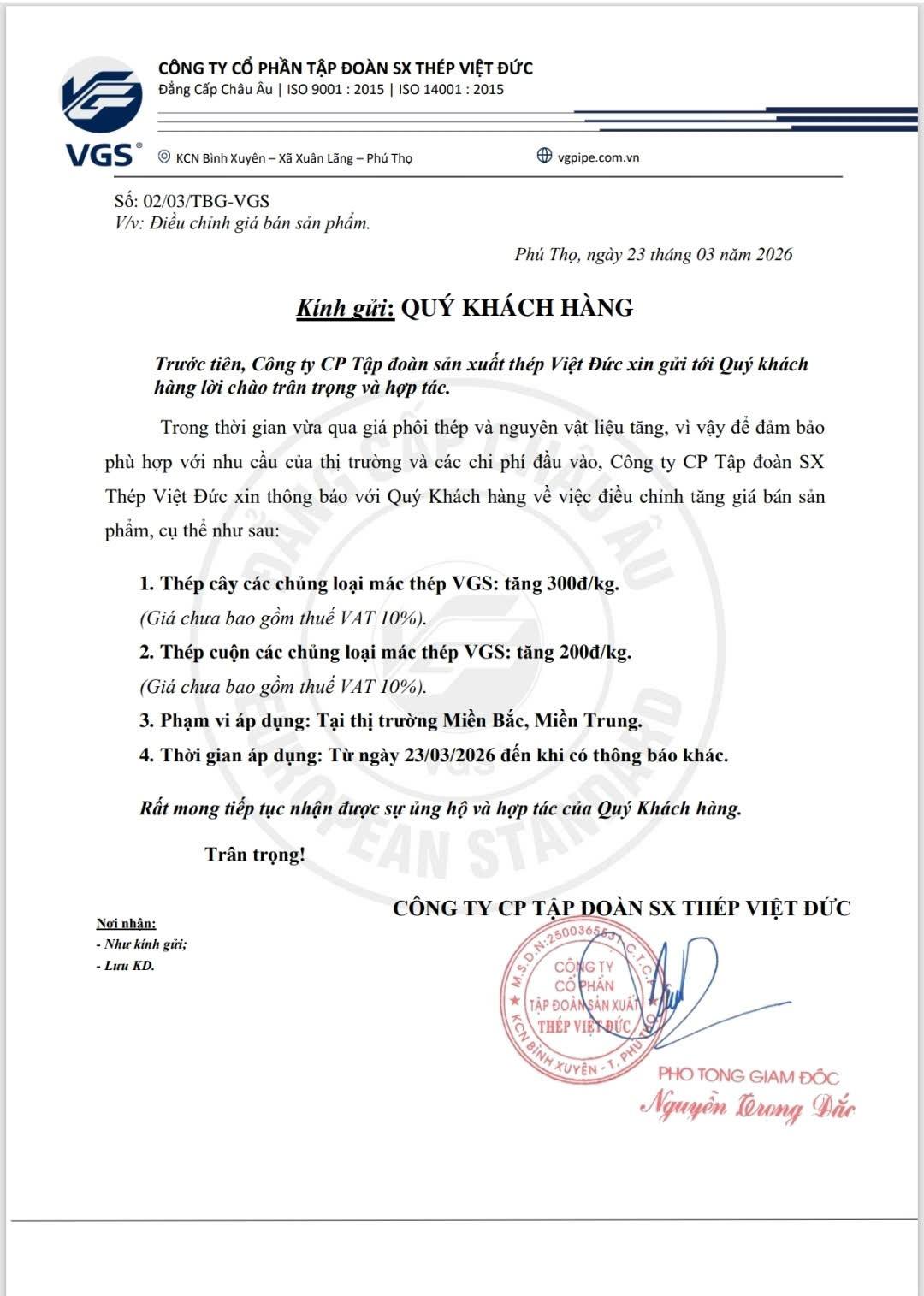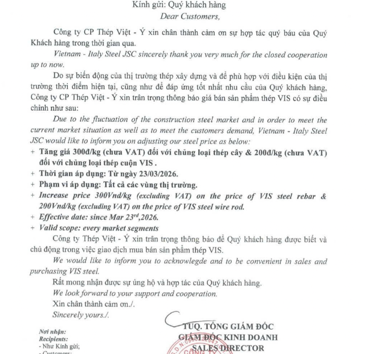 Tương tự, Công ty CP Tập đoàn sản xuất Thép Việt Đức cũng thông báo tăng giá với mức tương đương, áp dụng tại khu vực miền Bắc và miền Trung từ cùng thời điểm. Trong khi đó, Công ty CP Thép Việt Ý (VIS) triển khai điều chỉnh trên phạm vi rộng hơn, áp dụng cho tất cả các thị trường, với mức tăng 300 đồng/kg đối với thép cây và 200 đồng/kg đối với thép cuộn.