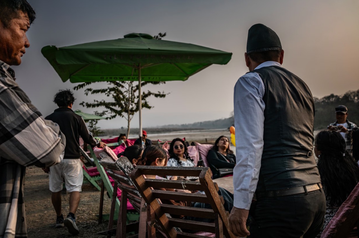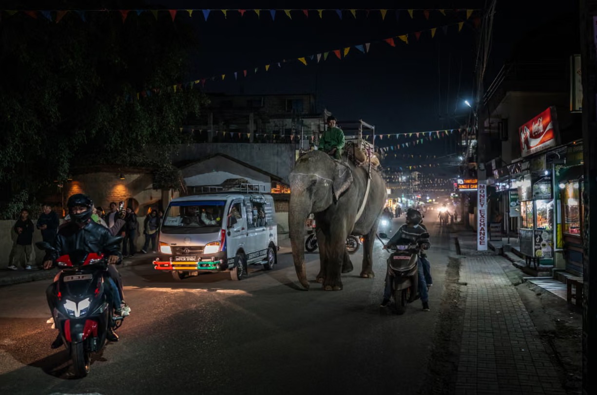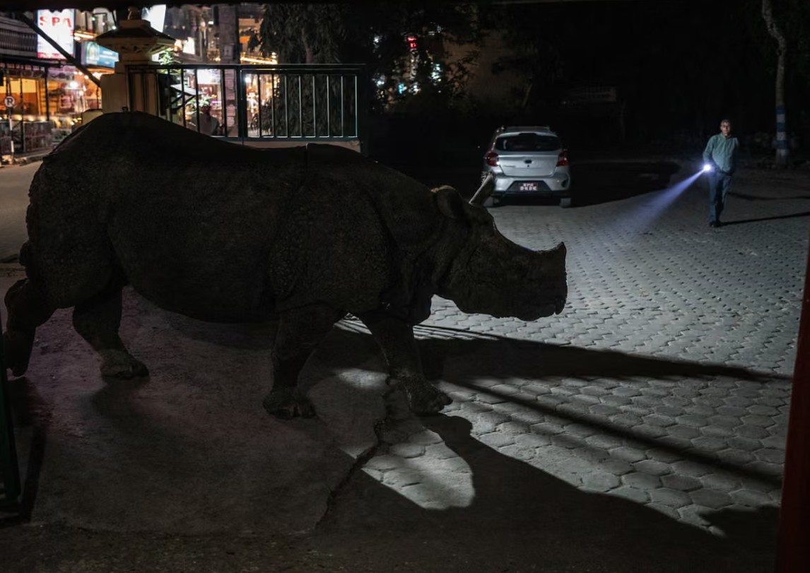 Đứng dọc theo bờ dốc thoai thoải, du khách reo lên thích thú, nhanh chóng lấy điện thoại lên chụp ảnh trong ánh hoàng hôn khi một con tê giác Ấn Độ đang gặm cỏ bên dưới ngôi làng Sauraha của Nepal. Điều đó chưa có gì kỳ lạ, bởi chỉ lúc sau, con tê giác này còn leo lên con phố chính, và thong thả đi giữa đường.