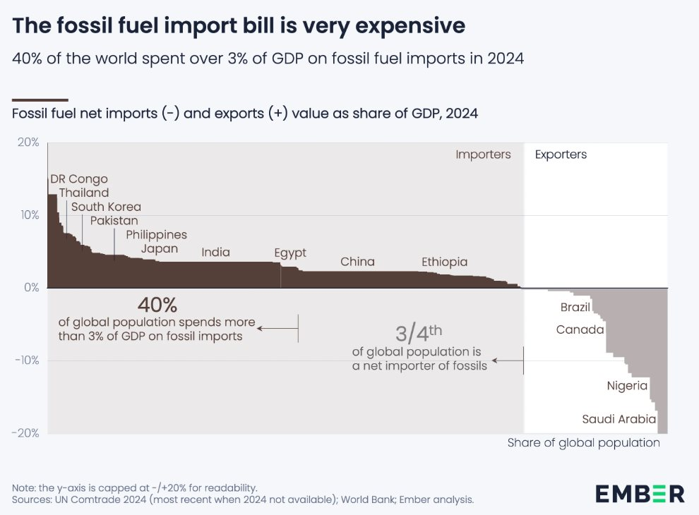 Số liệu từ báo cáo "The Energy Security Fallout" của Ember chỉ ra một thực trạng tàn khốc: Khoảng 3/4 dân số thế giới đang sống tại các quốc gia phải nhập khẩu nhiên liệu hóa thạch. Trong năm 2024, các nước nhập khẩu ròng đã tiêu tốn tới 1.700 tỷ USD. Đối với các quốc gia đang phát triển, đây chính là hiện tượng "rò rỉ GDP" (GDP Leakage) khiến nền kinh tế luôn ở trạng thái mong manh.