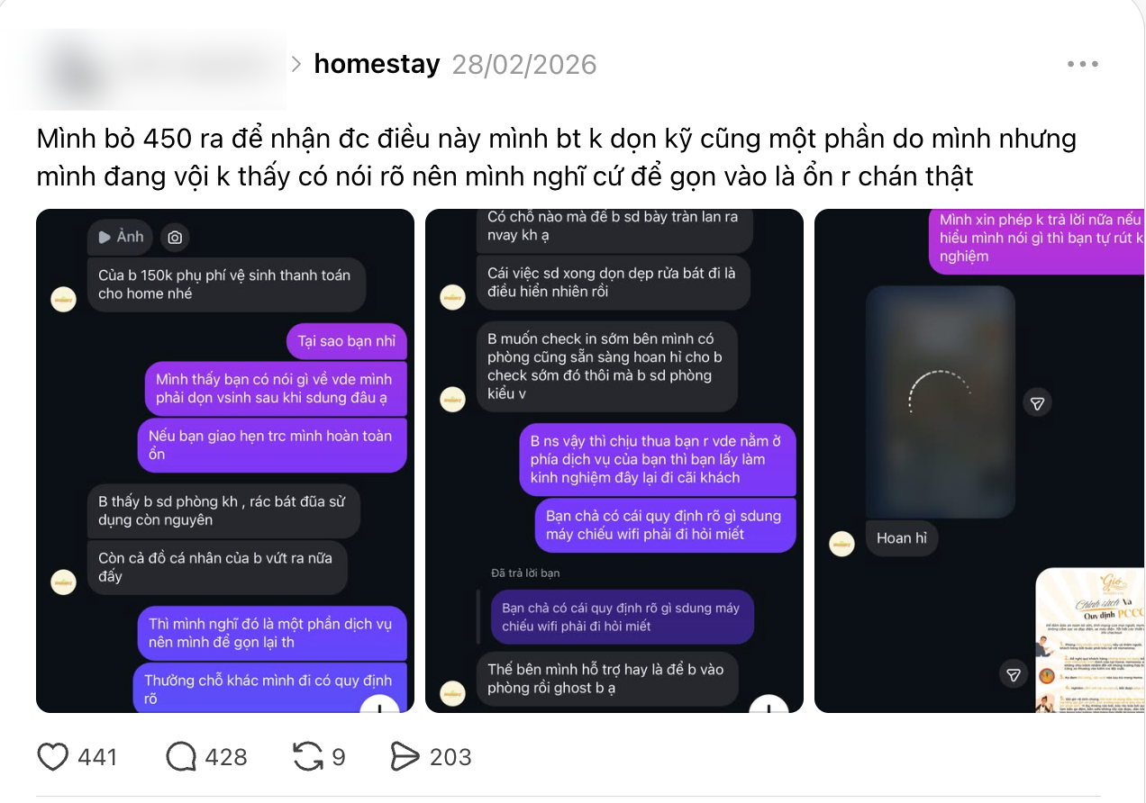 Bức xúc trước yêu cầu này vị khách cho rằng phí vệ sinh lẽ ra phải nằm trong dịch vụ trọn gói hoặc phải được thông báo minh bạch ngay từ thời điểm đặt phòng. Trong khi đó phía homestay lại giữ quan điểm khi khẳng định việc dọn dẹp và rửa bát sau khi sử dụng là điều hiển nhiên mà khách phải làm. Cuộc đối thoại nhanh chóng rơi vào bế tắc khi đôi bên có cái nhìn hoàn toàn khác nhau về việc vệ sinh homestay sau khi sử dụng.