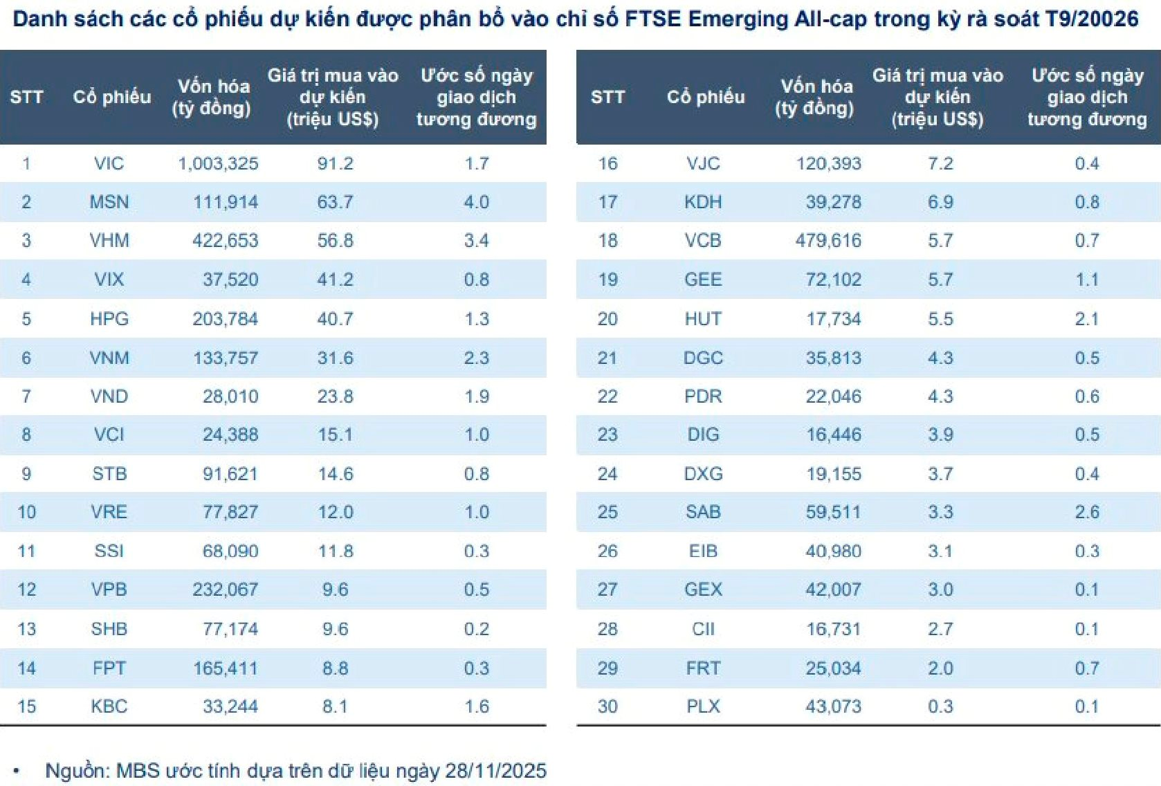 Theo một số nhận định, dòng vốn ngoại trở lại TTCK Việt Nam chỉ là vấn đề thời gian. Khi được nâng hạng, dòng vốn khổng lồ hàng tỷ USD đổ vào thị trường, điểm đến được dự báo sẽ là các Bluechips. Danh mục cổ phiếu Việt Nam có khả năng được FTSE Russell đưa vào rổ FTSE Global All Cap phần lớn là các cổ phiếu đầu ngành như nhóm Vingroup, ngân hàng, chứng khoán,…