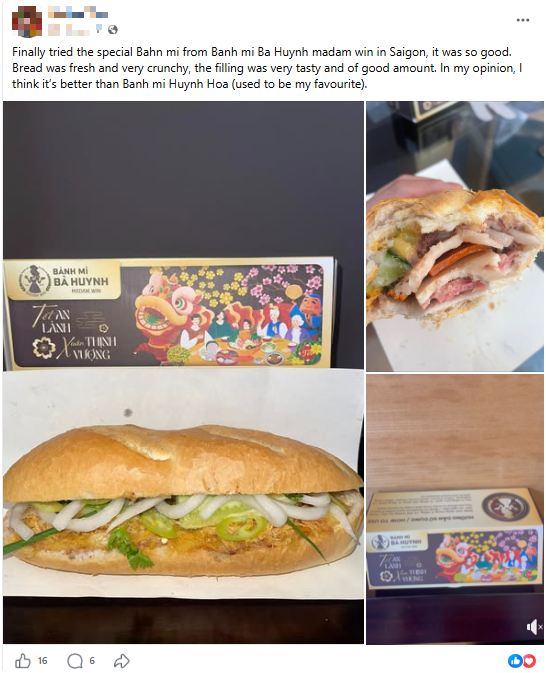 Du khách Didier Yue đăng trên nhóm trải nghiệm bánh mì bà Huynh nổi tiếng ở Sài Gòn, nhận xét là ngon tuyệt vời. "Bánh mì tươi và giòn tan, nhân bánh rất ngon và nhiều. Theo mình thì nó còn ngon hơn cả bánh mì Huỳnh Hoa (trước đây là quán mình thích nhất)", người này chia sẻ.