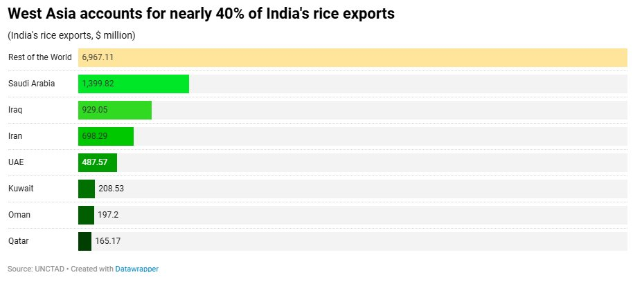 Xuất khẩu gạo của Ấn Độ sang khu vực châu Phi và Tây Á hiện chiếm khoảng một nửa tổng lượng gạo xuất khẩu của nước này. Riêng với thị trường Tây Á, gạo basmati chiếm tới khoảng 90% tổng lượng xuất khẩu, với giá trị thương mại ước tính khoảng 25.000 tỷ rupee mỗi năm. Điều này cho thấy mức độ phụ thuộc đáng kể của ngành gạo basmati vào các thị trường tại Trung Đông.